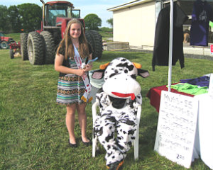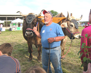 Dairy princess ambassador and her sidekick; Ralph Hartzell assures the crowd that the yoke is not too heavy for his two-ton oxen.