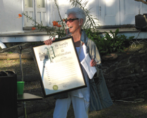 Amy Krzanik reports from Germantown. Clermont State Historic Site has a bevy of generous supporters and admirers (and with good reason), and this year they decided to honor one of their greatest champions. On August 1, the Friends of Clermont held their mid-summer benefit and cocktail party in honor of Germantown resident Joan K. Davidson, at left. The former commissioner of the NYS Office of Parks, Recreation and Historic Preservation and chair of the NYS Council of the Arts, is president emeritus of the J. M. Kaplan Fund and current president of its Furthermore program. A grants program started by Joan in 1995, Furthermore supports the publishing of non-fiction books and has provided funding to many book projects relating to the Hudson Valley, including three recent releases by the Friends of Clermont. Joan’s friends came from all over the region to honor her and her important work, and applaud enthusiastically as NYS Assemblymember Didi Barrett presented her with a large and lovely proclamation. Sometimes good work doesn’t go unrewarded.