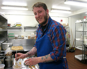 Amy Jeschawitz, a member of the Williamstown Planning Board, Carolyn Jones of Custom Business Solutions and Sandra Thomas, interim executive director of the Williamstown Chamber of Commerce; Chef Nicholas Moulton preparing chicken liver mousse with Lakeview Orchard preserved peaches and Mighty Food Farm onion confit.