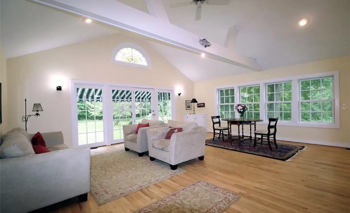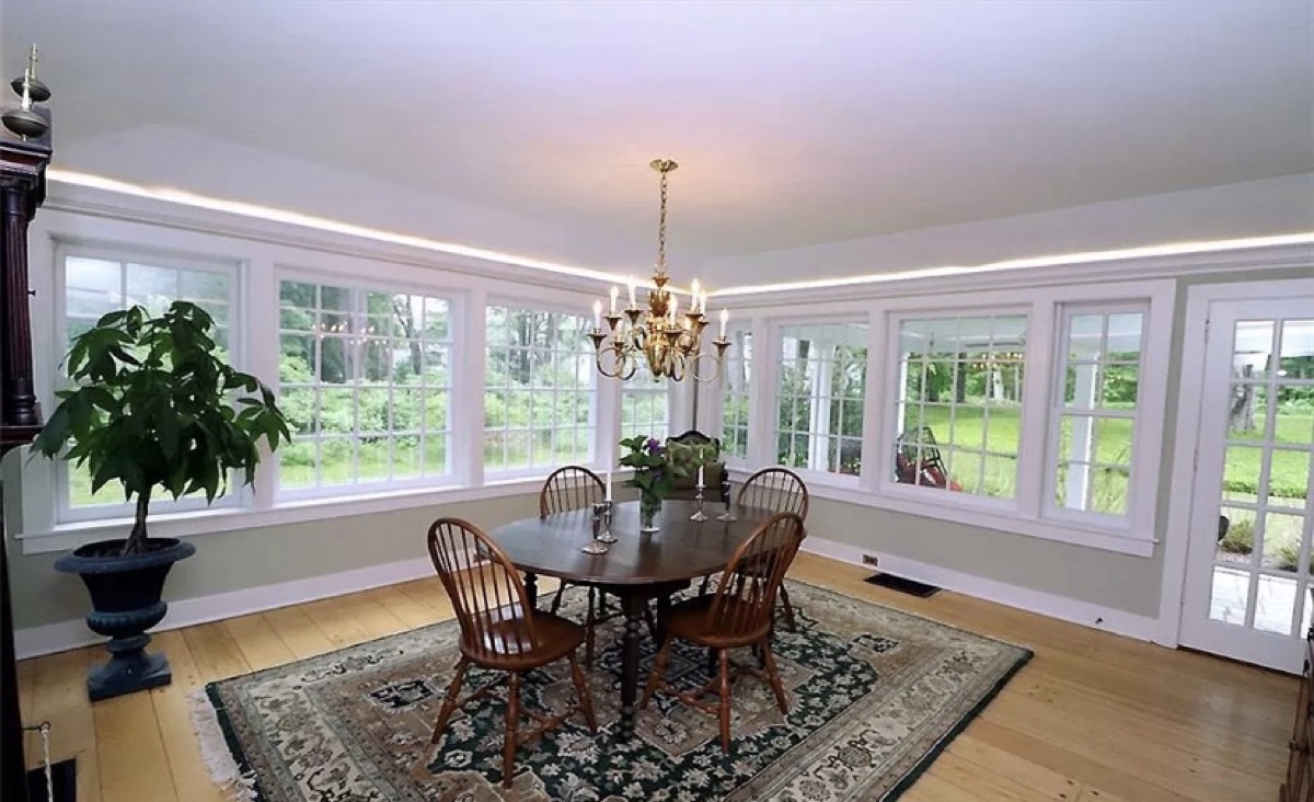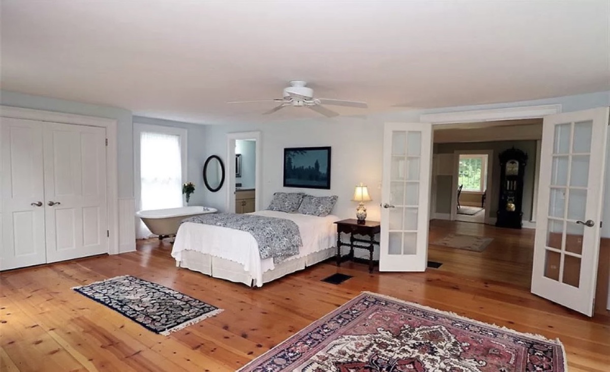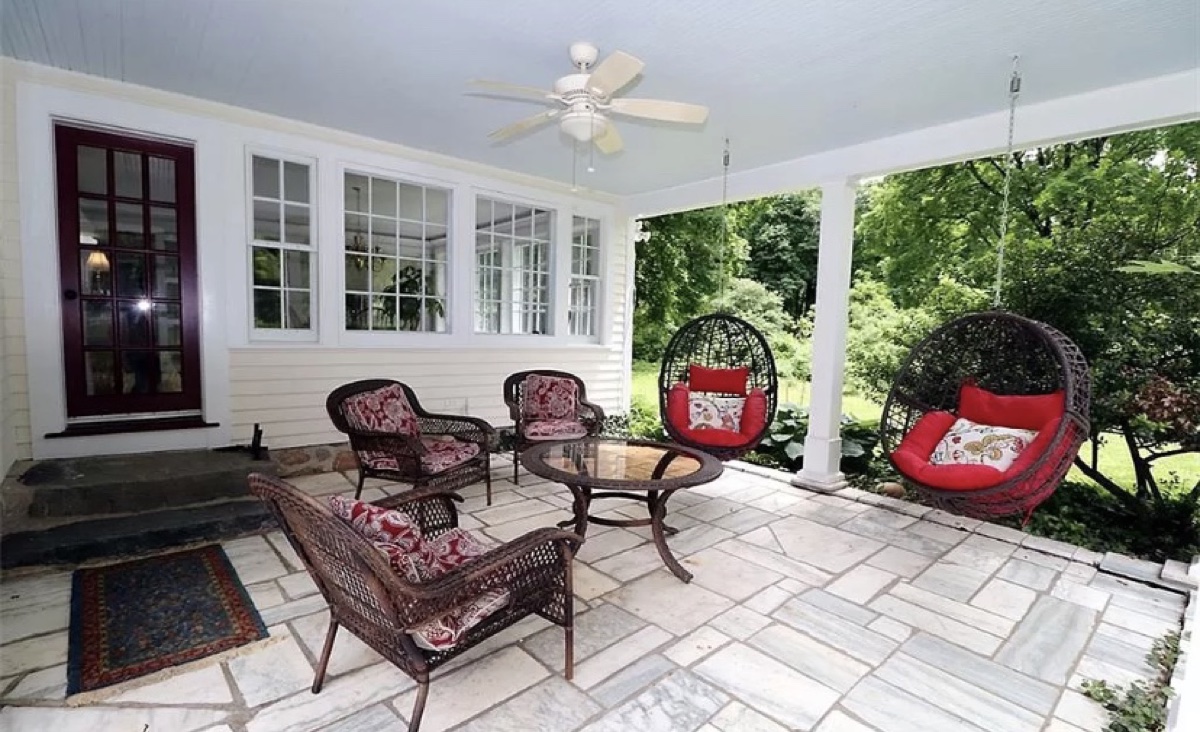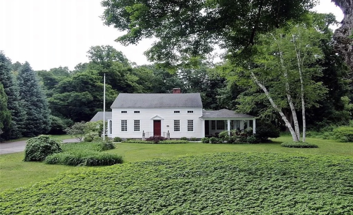In Barkhamsted, this 19th-century Colonial home with carriage house sits on 2.82 acres and abuts the Farmington River. There are 4 bedrooms and 3 bathrooms, an updated kitchen, laundry room, formal dining room and a formal living room with a fireplace. The first-floor master bedroom includes views of the yard from the window seat, French doors and a remodeled full bath. Outside there is a marble stone front porch overlooking the park-like grounds, with a fire pit on the brick, covered patio. Listed for $499,900 by William Raveis Real Estate.