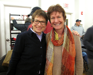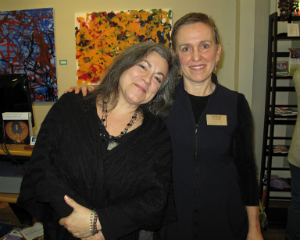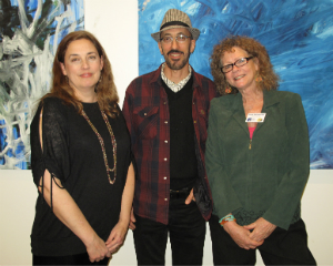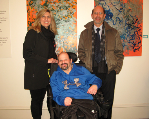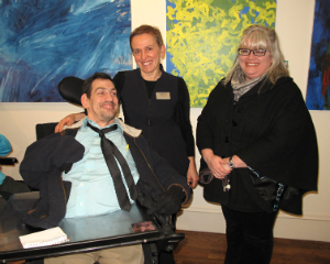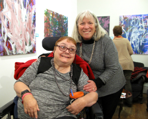 Amy Krzanik reports from Lee. Over the past two years, the Community Access to the Arts (CATA) “Art on Tour" program has made stops at The Clark, No. Six Depot and Berkshire Museum, among other county venues. To kick off 2016, its newest exhibit, Selected Works by CATA Artists 40 x 30 x 8, has made a temporary home for itself at College Internship Program'sGood Purpose Gallery. “40 x 30" refers to the size of the paintings and “8" refers to the number of artists in the show, many of whom were on hand at the opening reception on Friday, Jan. 15. All of the artwork in the show was created in Artistic Realization Technologies (A.R.T.) classes, offered as one of CATA’s many programs. A.R.T, an adaptive painting system developed by Tim Lefens, provides people with severe physical disabilities the opportunity to paint with the assistance of laser pointers and trained trackers acting as the hands of the artist. Fans of the CATA art program will be able to recognize the distinctive work of their favorite students in this show, which will up until February 16. All of the art is for sale, with proceeds going to the artists and CATA’s A.R.T. programs. Above, CATA founder Sandra Newman, with exhibit co-sponsors Rita Kasky and Bill Cohn.