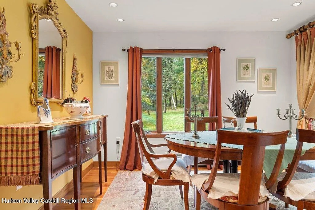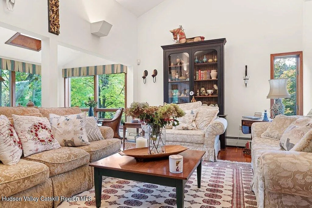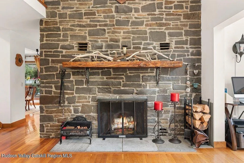The main living area has cathedral ceilings, and the primary bedroom suite includes its own fireplace and private porch. In addition to the central deck out back, there are multiple other decks and patios to pop out to. There’s a formal dining room and a three-season porch with views of the property. The lower level is finished and adds additional space.