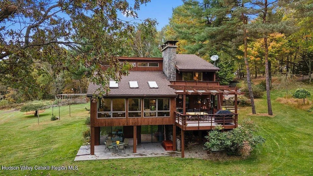 This is a really cool 90s contemporary cabin in Copake. Clad in wood siding with skylights and modern rectangular features, 388 Sky Farm Road has four bedrooms and four bathrooms over 3,080 square feet. It has an open layout traditional to its time period, with a large back deck with pergola ceiling, a central rectangular chimney with brick on the outside, and kitschy tile and stonework in the kitchen.