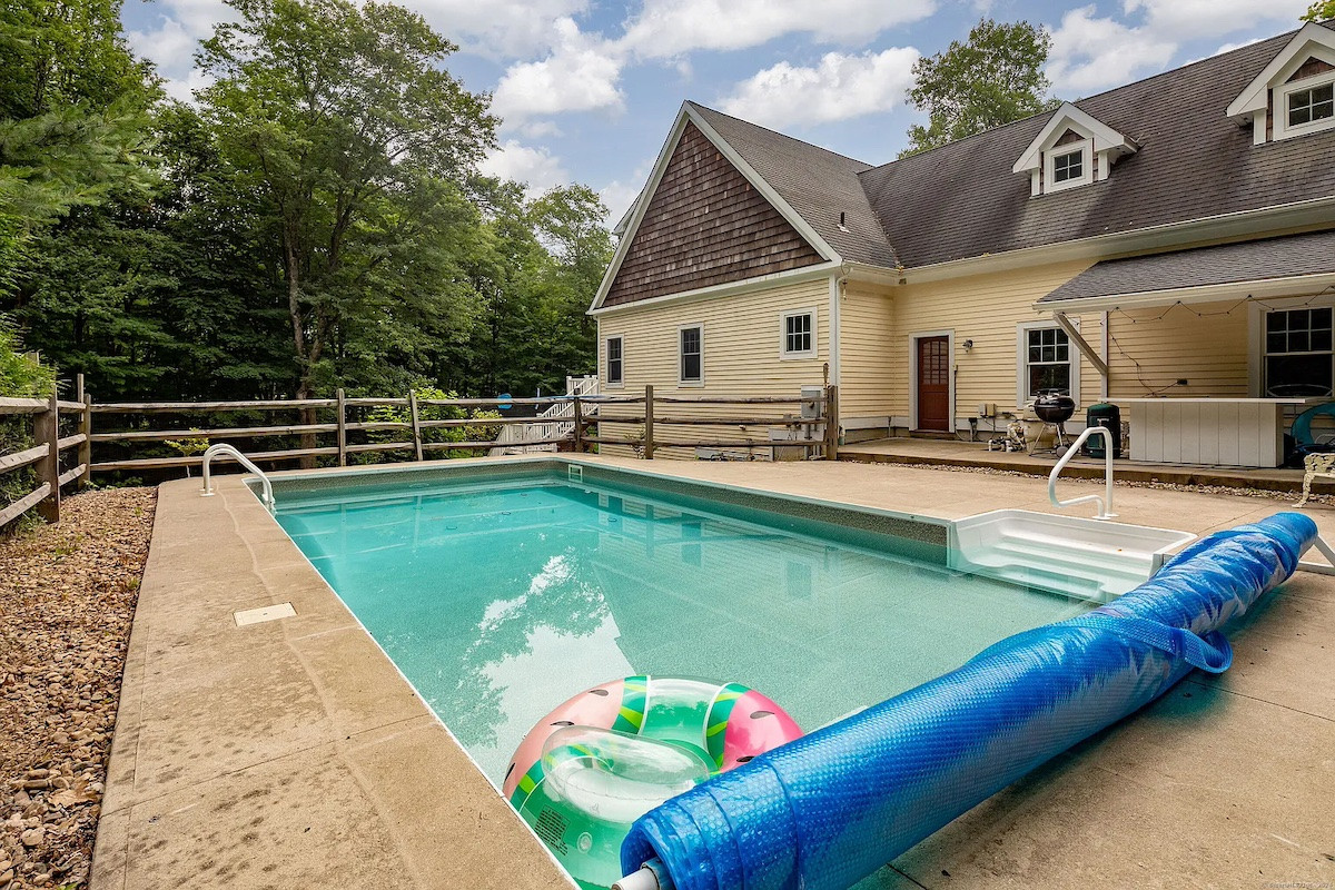 Built in 2004, this Cape-style home in Litchfield offers five bedrooms and five bathrooms in over 5,000 square feet. There are hardwood floors throughout, a fireplace, cathedral ceiling, and large kitchen with two pantries. The lower level is fully furnished with a gym, rec room, full bath and office space. Outside is a saltwater pool and fenced yard on two acres. Listed at $850,000 by Raynard & Peirce Realty.