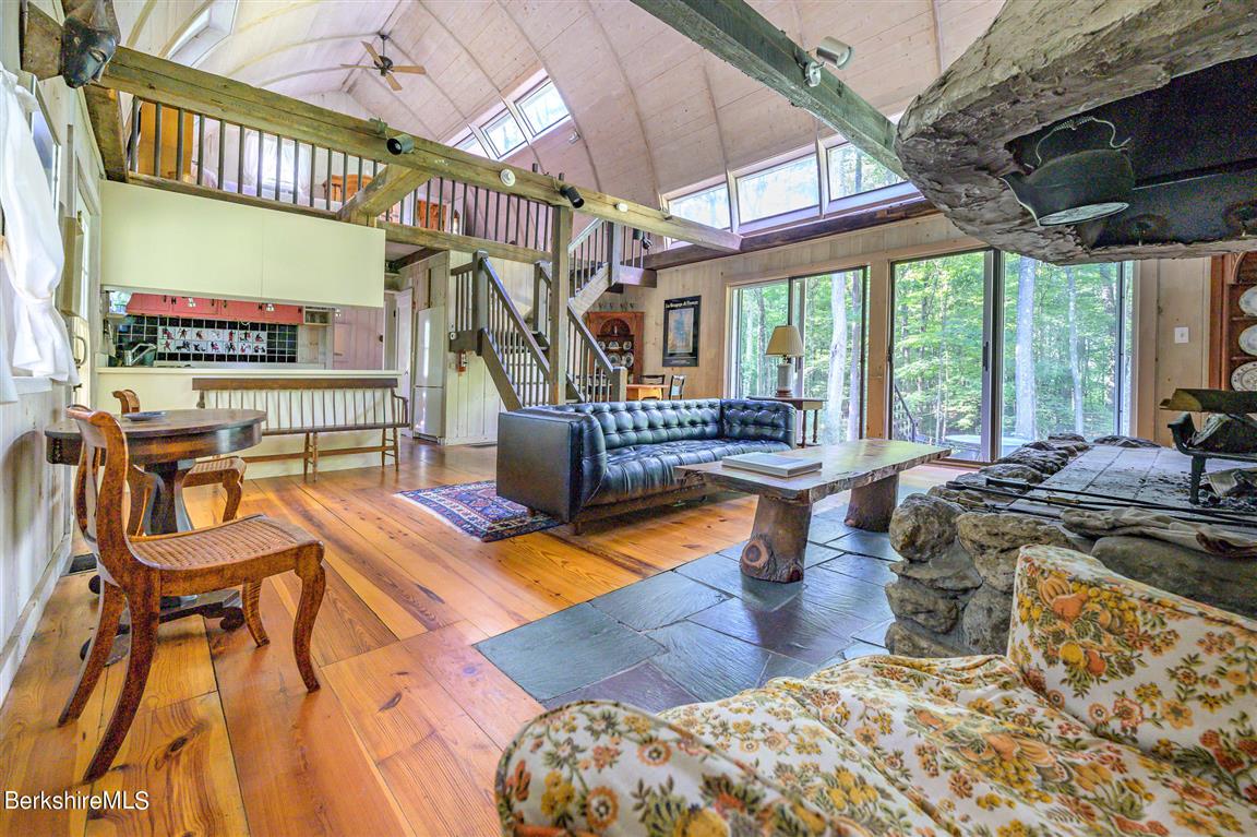 The private setting in West Stockbridge envelops a two-bedroom, two-bathroom home converted from a barn. The living spaces were designed around the raised heart fireplace. There is one bedroom/bathroom and sauna on the first floor; the second floor offers an open loft bedroom/bathroom with a spiral staircase through the silo. There are woods and a stream on the 8.2 acres. Listed at $700,000 by Stone House Properties.