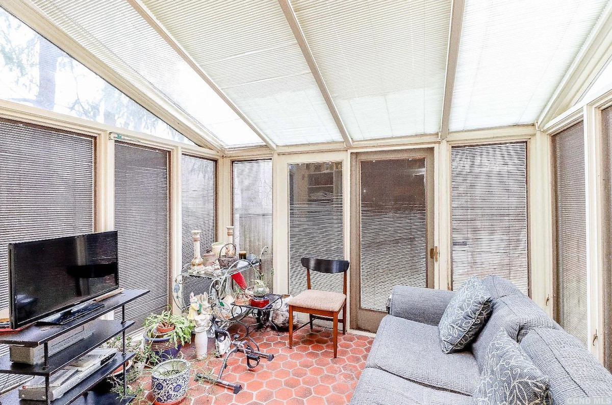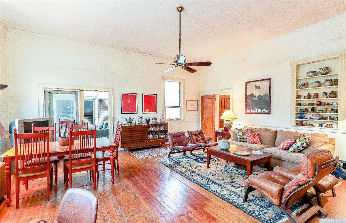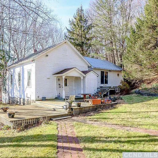 Formerly a one-room school house, this now-contemporary home in East Chatham has two bedrooms and two bathrooms and an open floor plan. The school's main room is now an updated kitchen, dining area and living room. A four-season sun room leads out to one of the many decks surrounding the home. The red barn/garage has an easy-access loft. The property comes with Queechy Lake rights. Listed at $368,000 by Beach & Bartolo.
