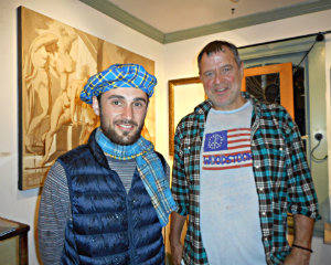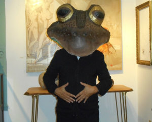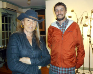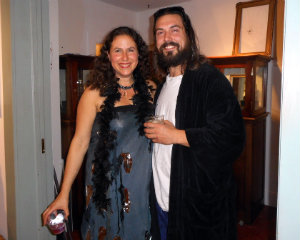 Lisa Green reports from Great Barrington. You can’t expect Halloween in the Berkshires to be anything less than artful, and that was fully expressed at L’Atelier Berkshires Art Gallery on Sunday, Oct. 29. Gallerist Natalie Tyler took advantage of the Halloween spirit by combining a come-as-you-please party with an art salon and made it work. Amidst hors d’oeuvres (including caviar and pâté “stations” arranged by Torrey Oates of Amuse Culinary Events) and cocktails, glass artists Iva Kalikow and Debora Coombs spoke about their work, describing their inspiration and techniques, as did painter Michael Allen Lowe. Every couple of minutes, the door creaked open and, from the pouring rain outside, an alter ego of some sort or another stepped into the gallery to be admired by the guests. And if you don’t think it’s a little disconcerting having a conversation with a big toad head, you ought to try it some time. [Above, gallery owner Natalie Tyler and Adam Zamberletti, a.k.a. The Big Lebowski.]
