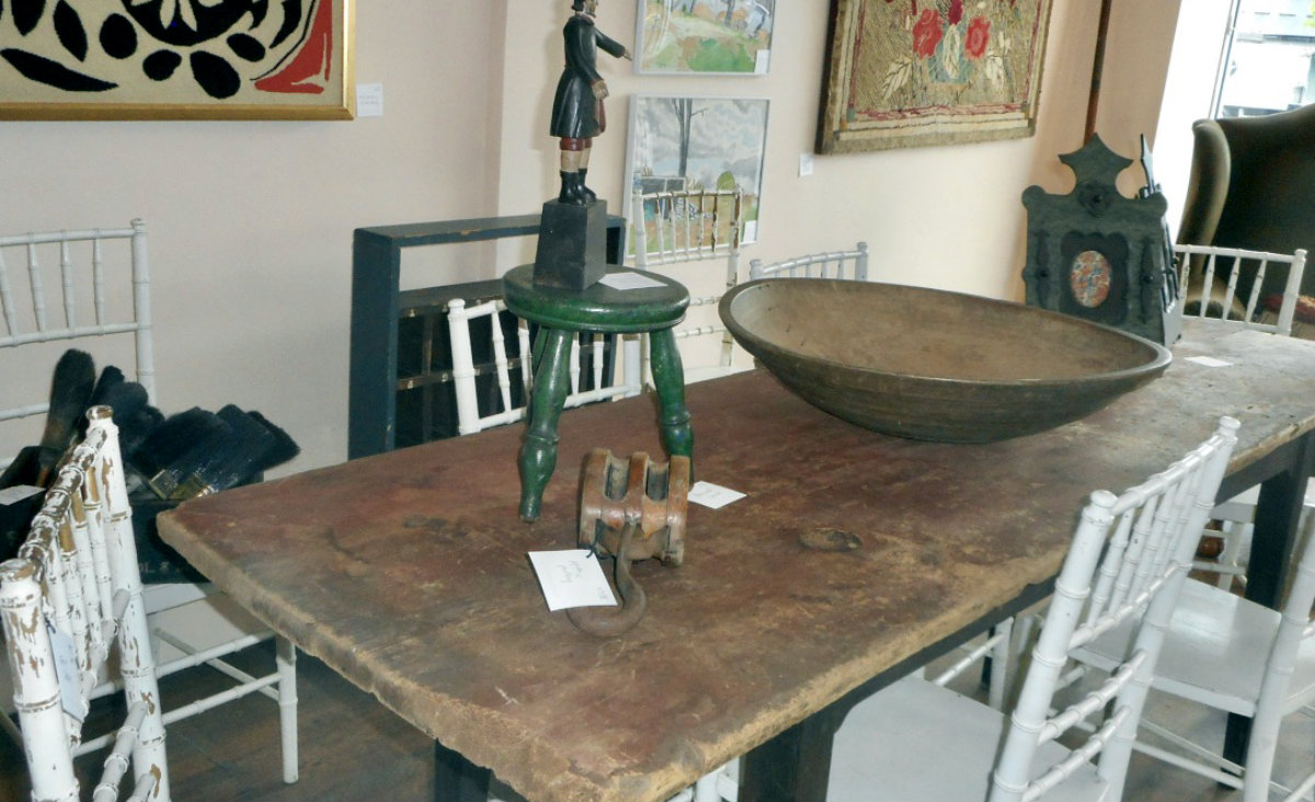 The scope of Americana plus decorative arts is wide ranging. “We’re not gallery precious,” says Krynick. “It’s all stuff we really like.” Recent finds include a c.1860 carved and painted jelly cupboard and mid-19th-century printing blocks for labeling fabric.