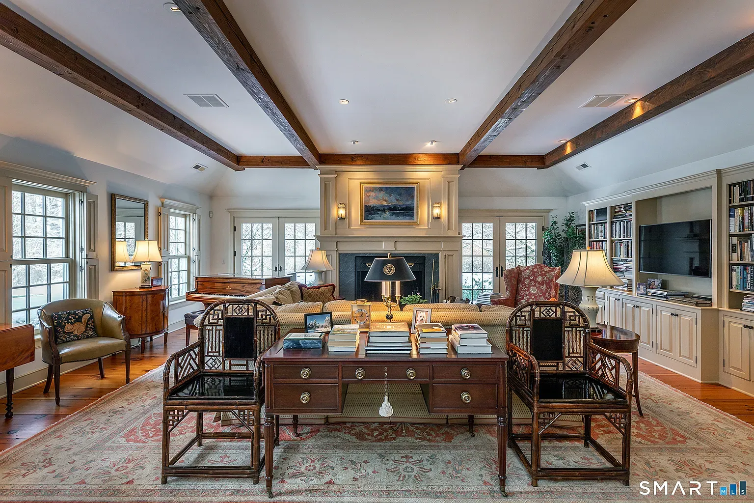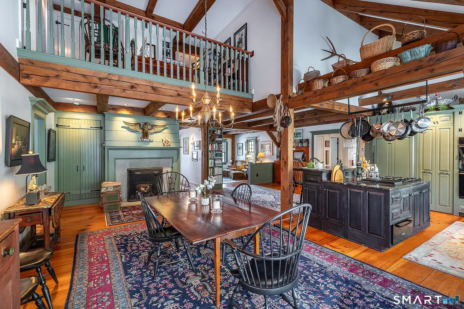 The interior centers on a dramatic open kitchen and dining room, where exposed wood beams and a soaring cathedral ceiling create the home’s architectural focal point. A stone fireplace anchors the space, lending a rustic warmth that balances the otherwise polished interior. From here, French doors open directly to a broad bluestone terrace, partially shaded by a pergola and sized for outdoor dining and long summer evenings.