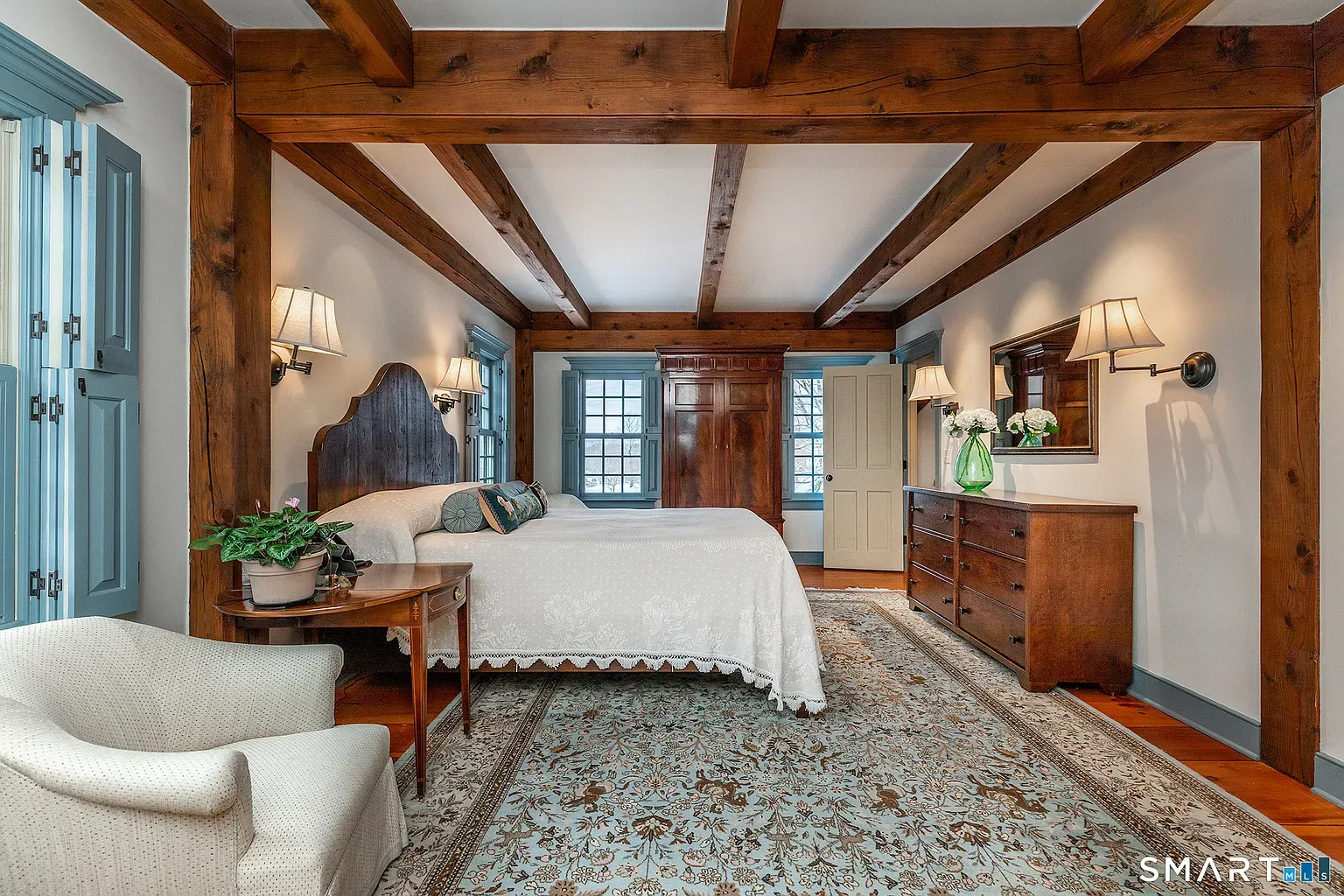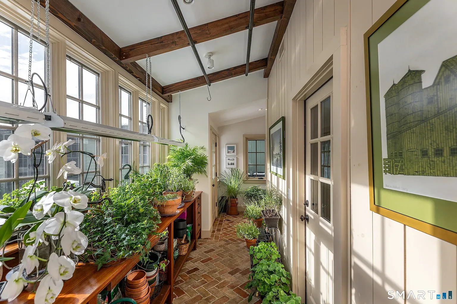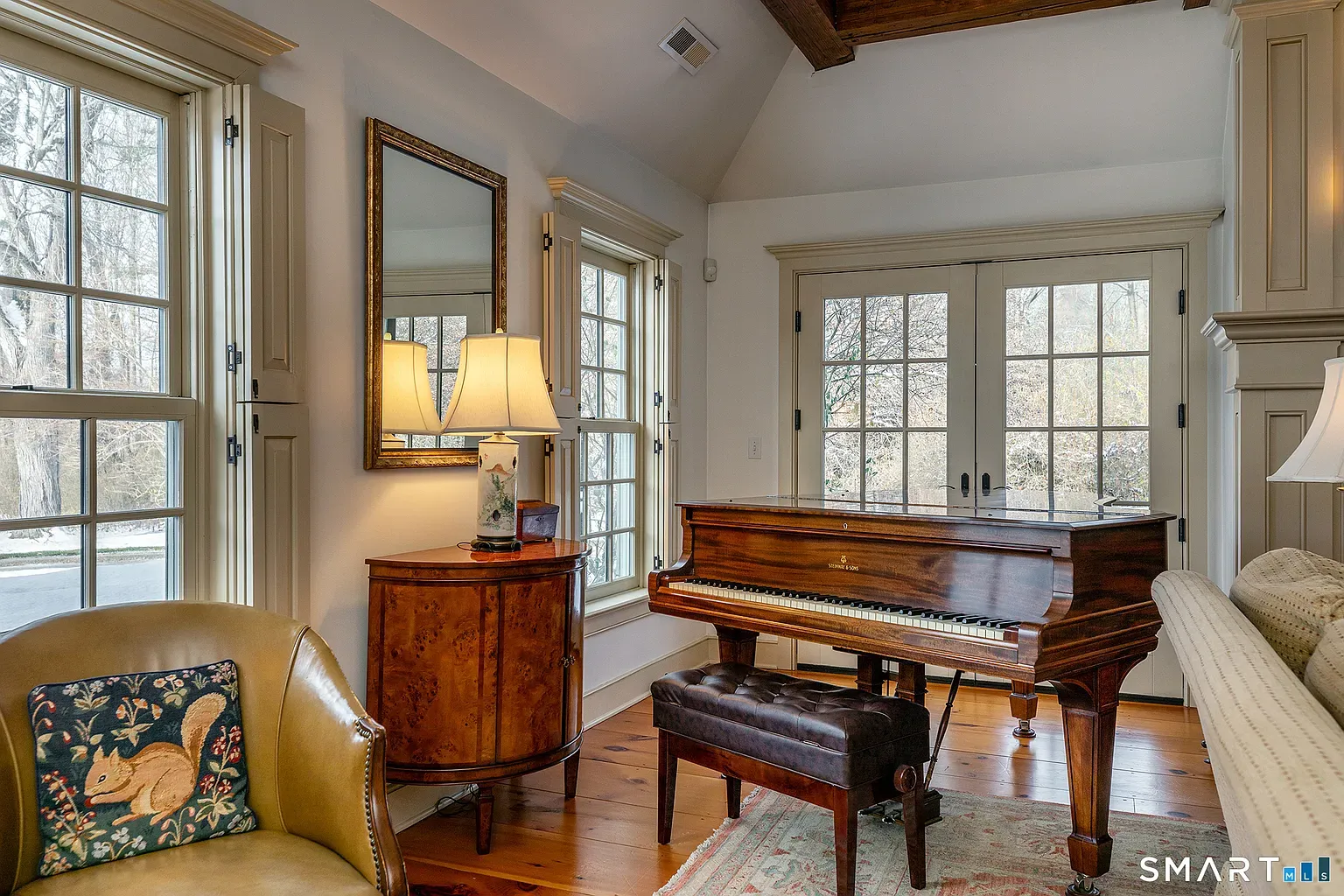 Outside, the land feels intentionally composed but not overly manicured. The broad lawn gives way to trees and garden edges, creating privacy without isolating the house from its village context. From this address, you can walk to Sharon’s green, library, and local cafés while still enjoying the sense of open country that draws people to the Litchfield Hills.