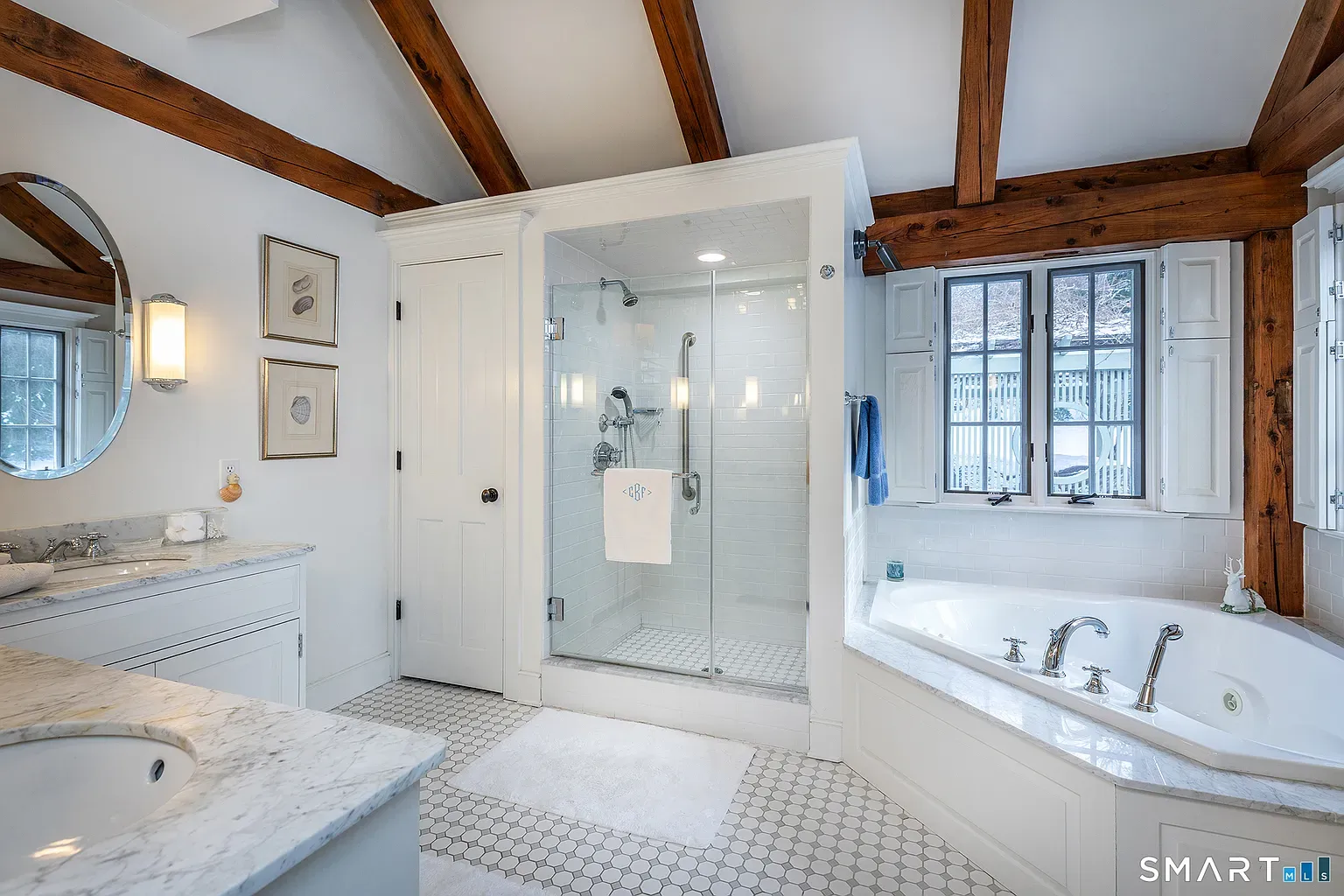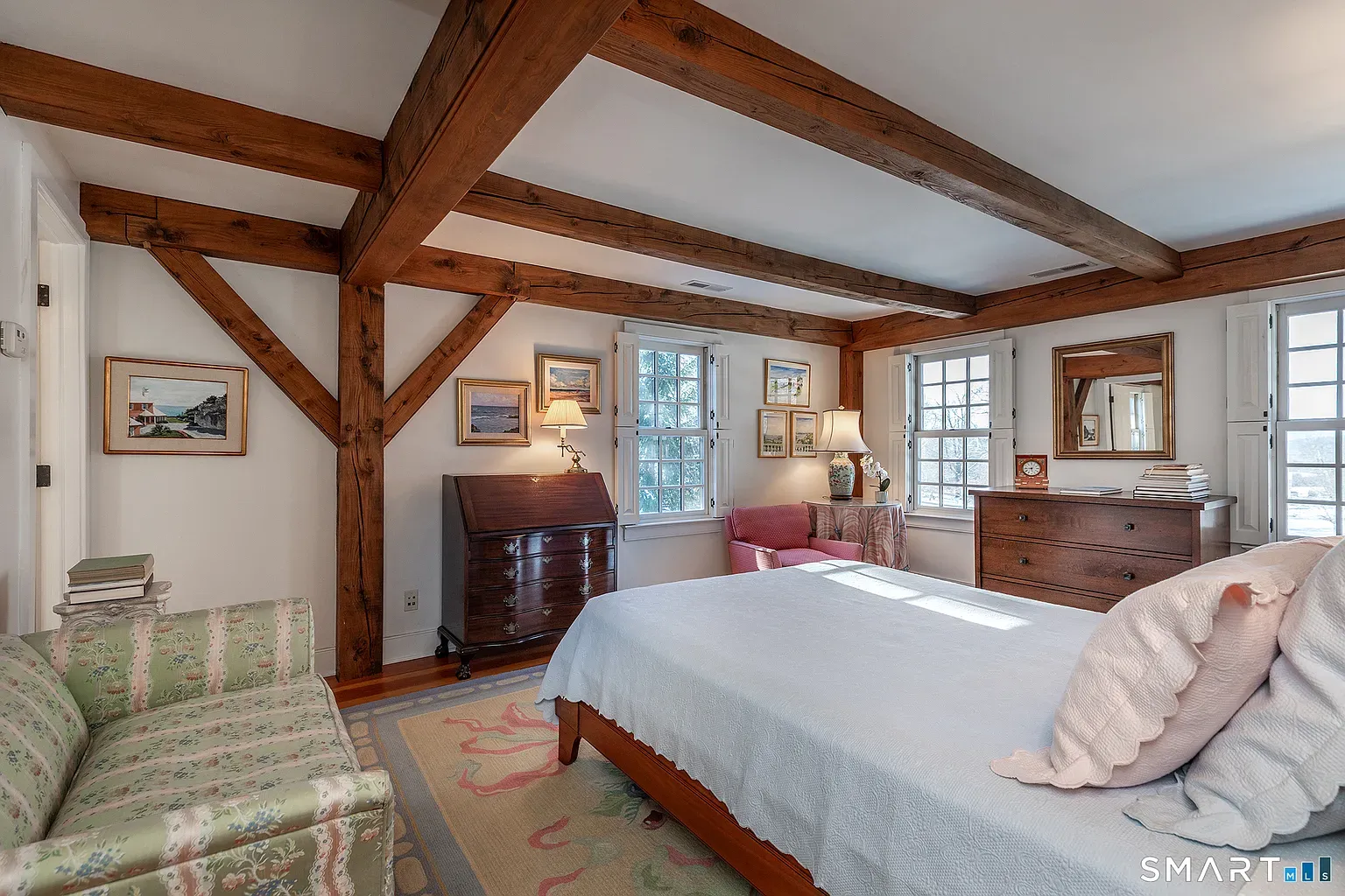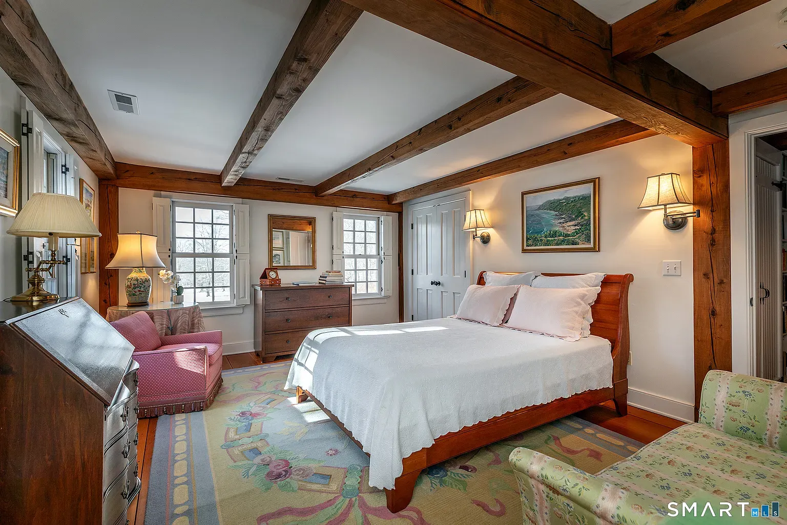 Built in 2004, the home spans roughly 4,449 square feet with four bedrooms and four-and-a-half baths, designed with the sense of scale and quiet formality typical of Sharon’s larger country houses.