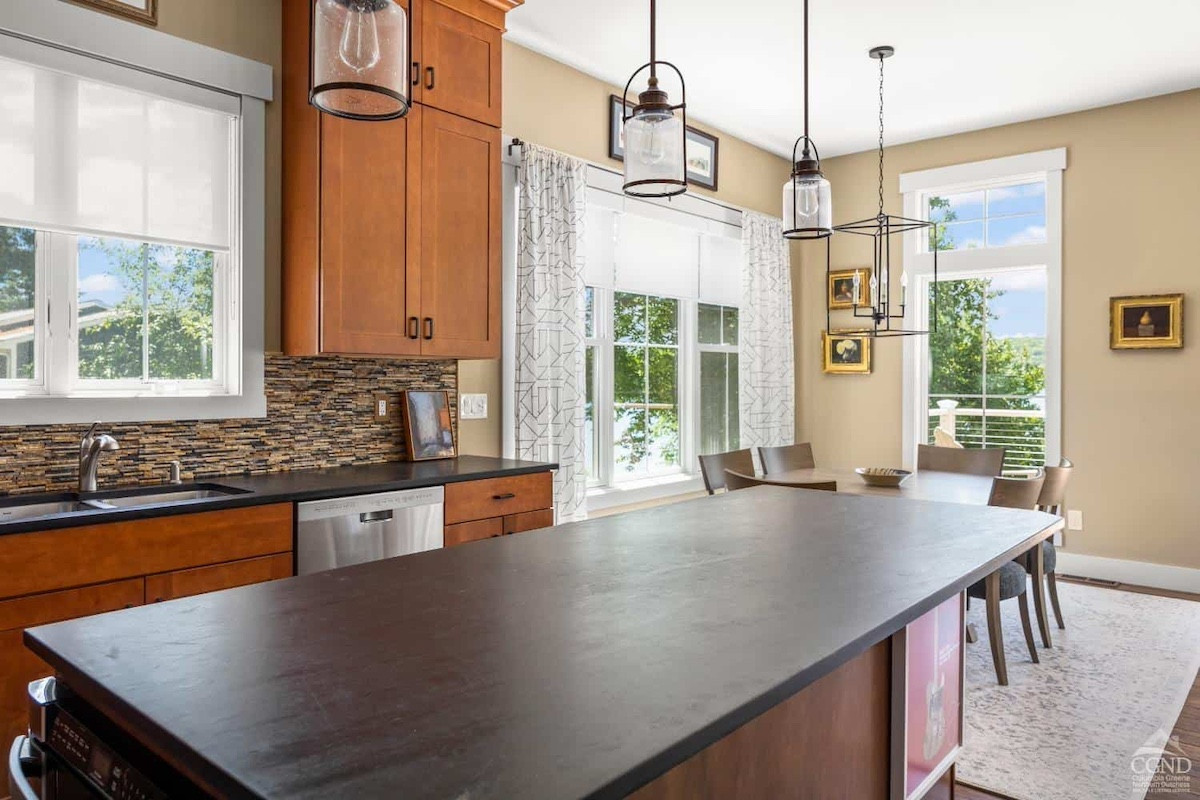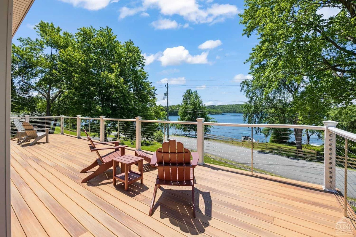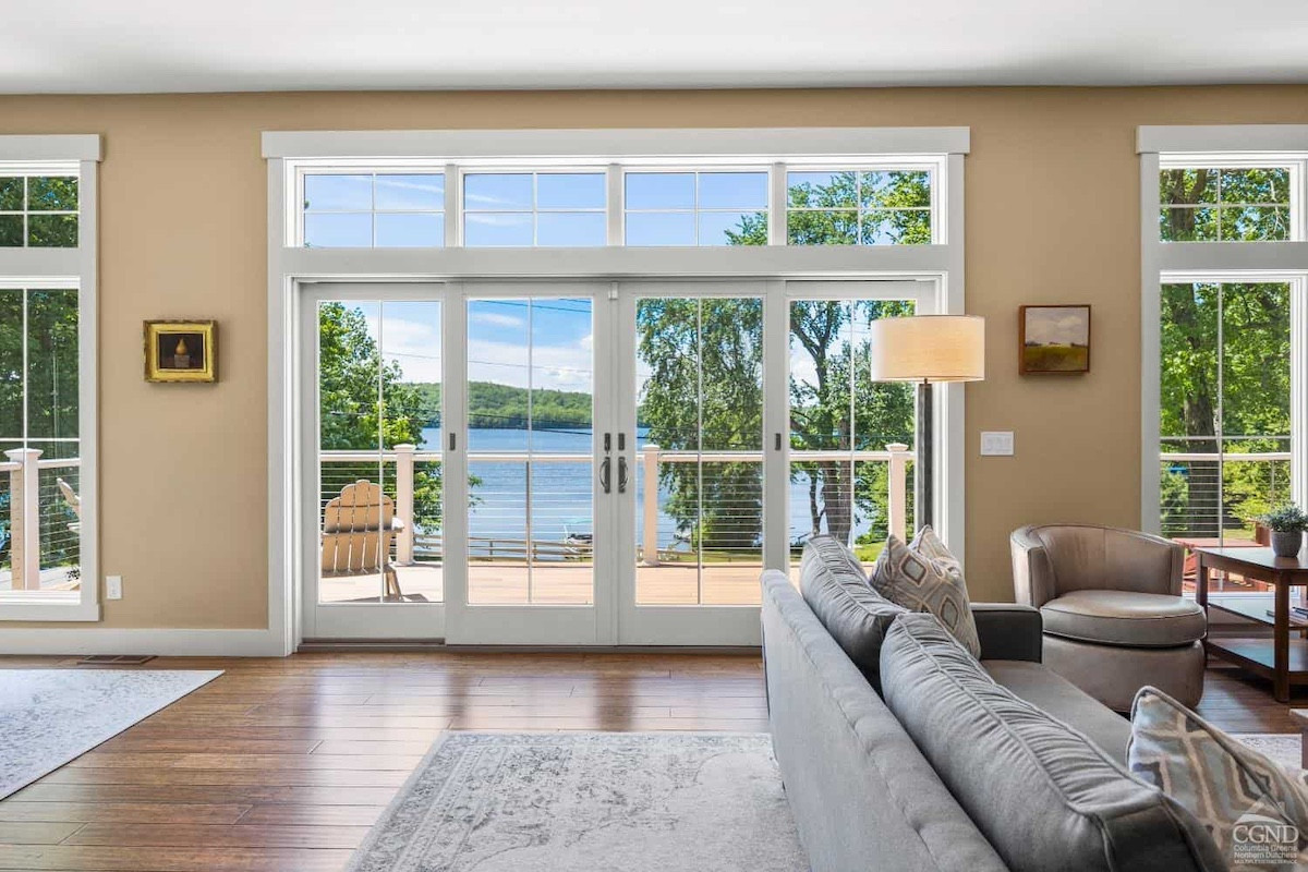 Situated on the shores of Copake Lake, this modern three-level Craftsman home offers four bedrooms and five bathrooms and an open-concept layout. The property includes 70 feet of exlusively owned waterfront property with a new 40-foot dock. Listed at $2,250,000 by Copake Lake Realty.