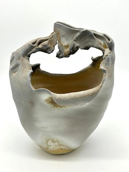 Commanday has built a new life for herself, and a new body of work has evolved from her experience — not just the wildfire, but her long journey with ceramics in America, Israel and Japan. The new series of vessels she is making echoes the theme of creation and destruction that flows through this story. With great care, time and effort she turns a pot on her wheel. Then she waits for the clay to be just the right consistency and she attacks its opening in a sudden moment of force, tearing and cutting, creating wing-like shapes or a pseudo-basket handle. The results are vases that visually tell the story of their creative process. The torn edges of the openings have the added benefit of gripping stems in interesting ways for dynamic flower arraignments.