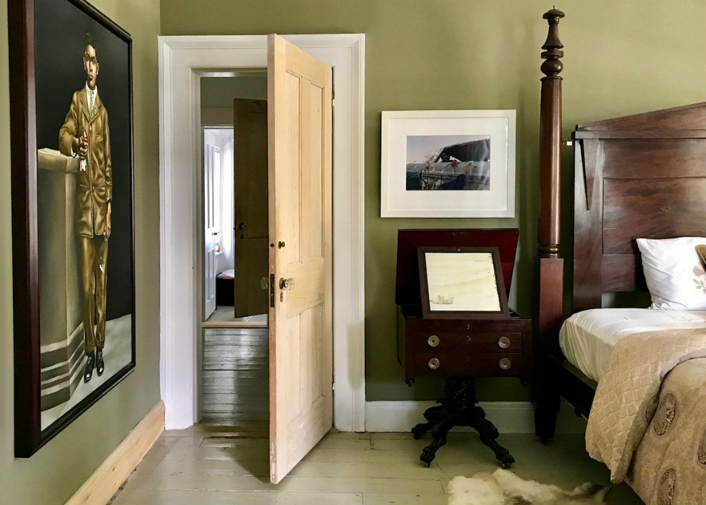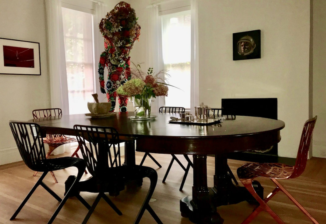 In this home, an unusual balance is delicately maintained, the owners constantly redefining the space as a museum and a private home. An immense Gothic Revival mahogany table (its twin lives at Gracie Mansion) purchased from neighbors fills the dining room with the memory of Hudson’s rich heritage. A six-foot Nick Cave Sound Suit towers behind it, lifelike and energetic, poised to travel across the river in May to Olana for a major installation. This cross-pollinating twosome embrace domestic life and culture equally, enjoying historic real estate with no ghosts attached.