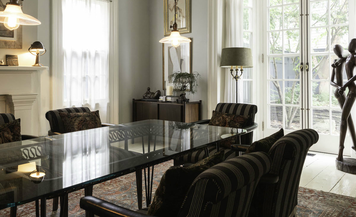 By retaining significant historic details, including original wide-plank wood floors, a brick fireplace in the parlor and classic eyebrow windows, the house has become a bridge between old and new worlds. Not surprisingly, the dark palette, striking vintage furniture and rich fabrics the couple have chosen for the interior design of their private home evoke a dramatic elegance not unlike The Maker Lounge and Cafe, only a few blocks away.