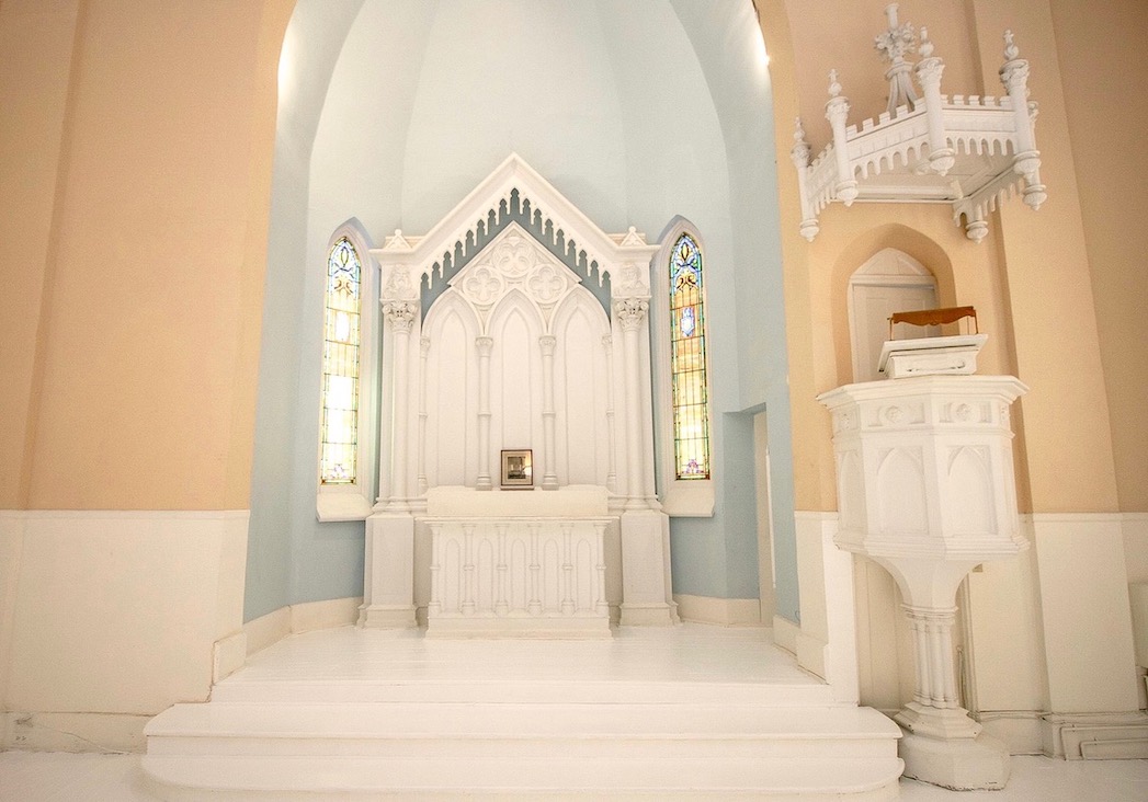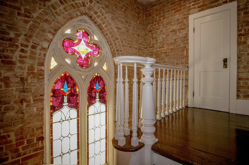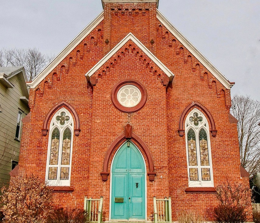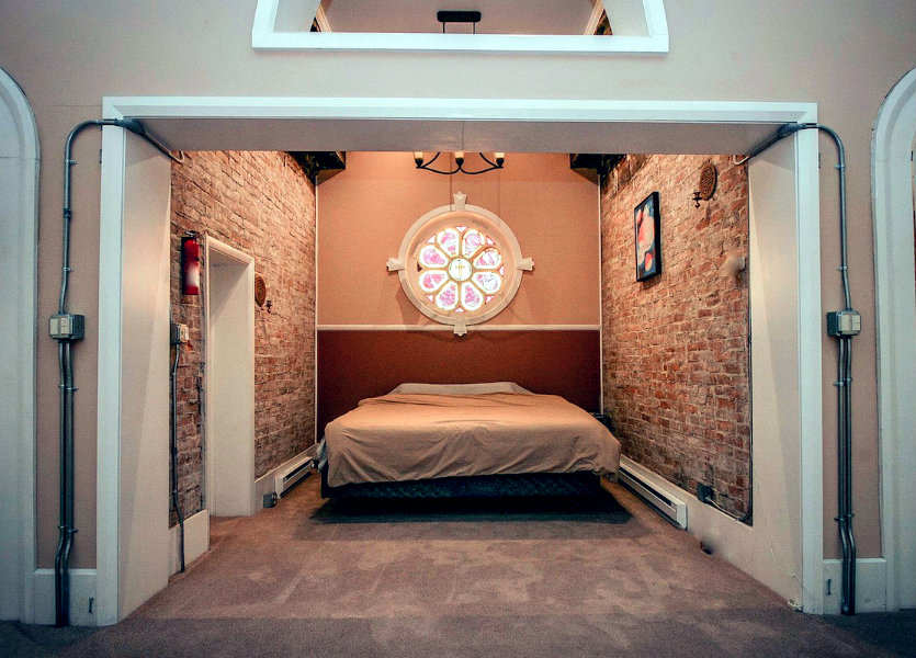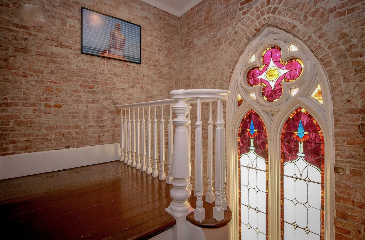 Venturing north of Warren, Hudson’s prime shopping avenue, we’re directed towards an 1870s red brick Gothic church. Once the home of Saint Matthew’s Lutheran Church congregation, the 2,500-square-foot space, with stunning 30-foot ceilings, features the characteristic spire and cross, stained glass windows and pulpit typical of many early American Protestant churches from this time period. Currently, this former house of worship is the upstate headquarters of the Jonah Bokaer Arts Foundation.