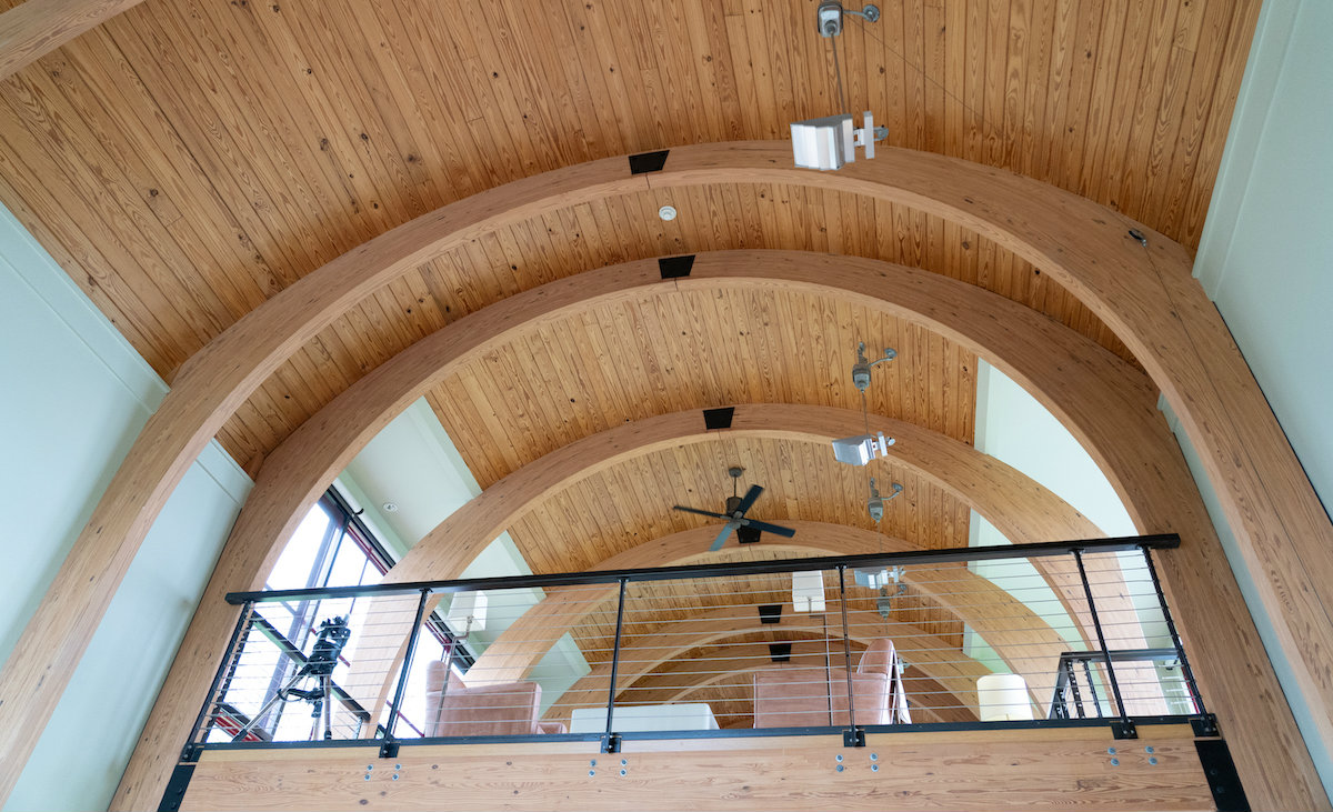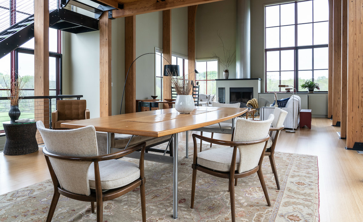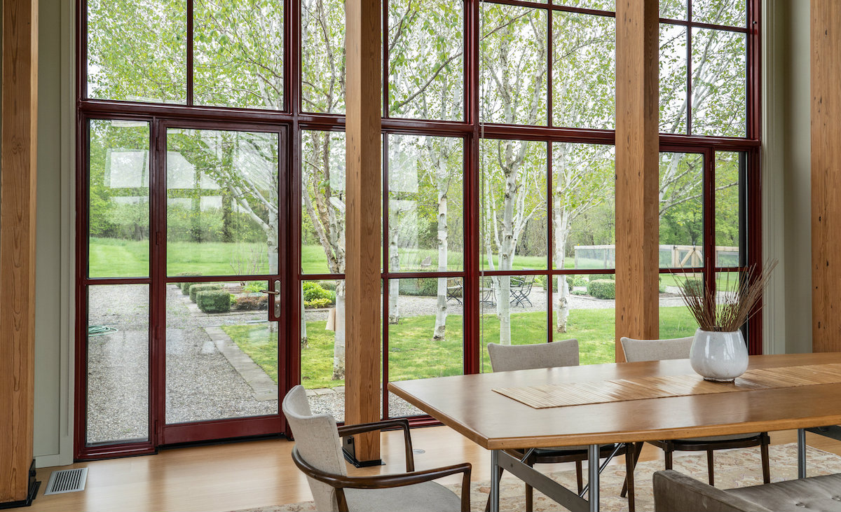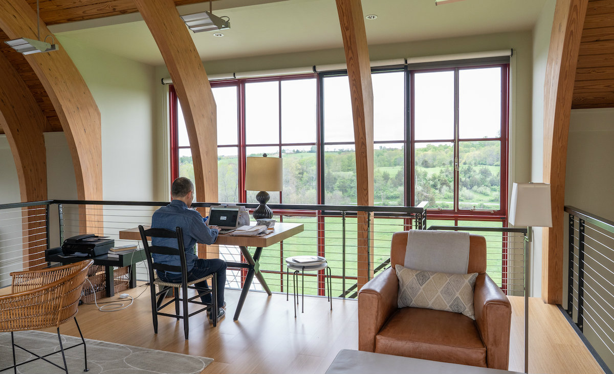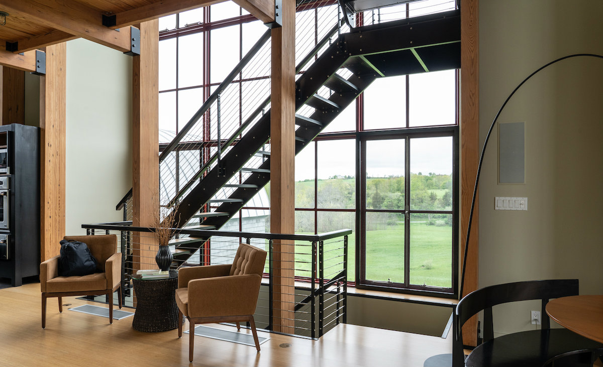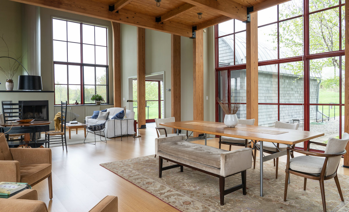 The dramatic architecture, with a 21st century nod to the vernacular of the grange, incorporates uber energy-efficient construction techniques and building details. These features include 14 foot x 8 foot locally made custom steel windows by Optimum Window located in Ellenville, NY, and custom barn-door-style window screens fabricated by James Romanchuk & Sons. The massive windows allow stunning panoramic views, and the screens keep bugs and bats at bay. The soaring pre-fabricated glue-timber frame beams are also manufactured locally by Unadilla Silo and Barn — the same company that assembled huge laminated timbers for hundred-year-old barns in the neighborhood.