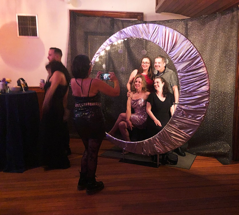 “Dewey Hall has been promoting cheerfulness and intelligence since 1887,” declared Board Member Beth Carlson, at Dewey Hall’s Celestial Ball on Saturday, Feb. 10. On that night, the nonprofit that’s all about strengthening community also promoted a magical, moonstruck celebration on the final night of its Reaching for the Stars annual fundraising campaign. Guests were encouraged to dress in their best sequins and sparkles and they duly arrived in shimmery sartorial splendor. DJ BFG supplied the tune for dancing; Leah Guadagnoli of Fancy Feast Supper Club set out a bountiful spread of her vegetarian hors d’oeuvres; and Emily Schulmann of GettinIntuit offered tarot card readings. Constructed in 1886, the fieldstone, marble and shingle Dewey Memorial Hall was built with mission of connecting community members through social entertainment and cultural activities. With all of its current programming — including jazz jams and other live concerts, storytelling events, game nights, and the annual sourdough bread contest — Dewey Hall continues to serve as a community space that engages people of all ages and backgrounds. "By reaching for the stars we got to the moon!,” said Carlson. “Funds from this campaign will give us a good start for 2024.”