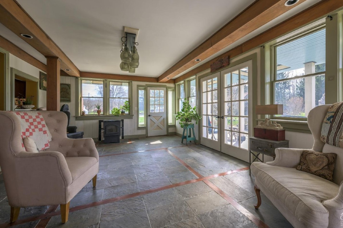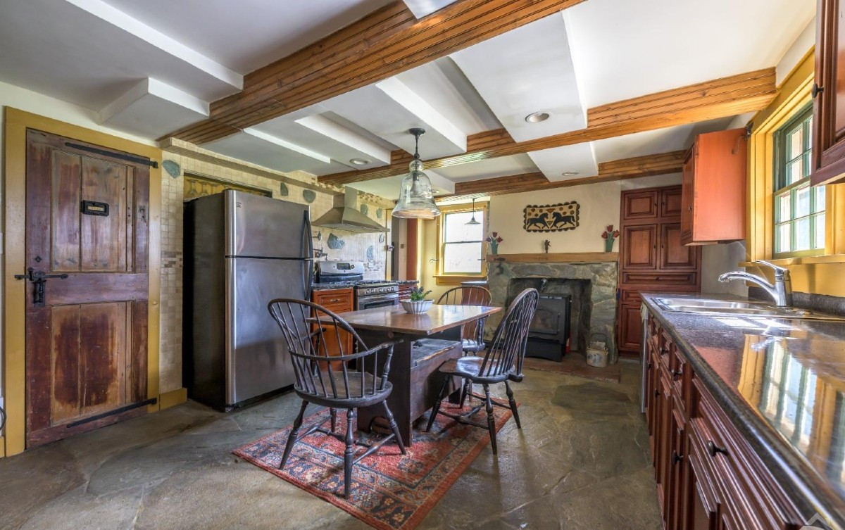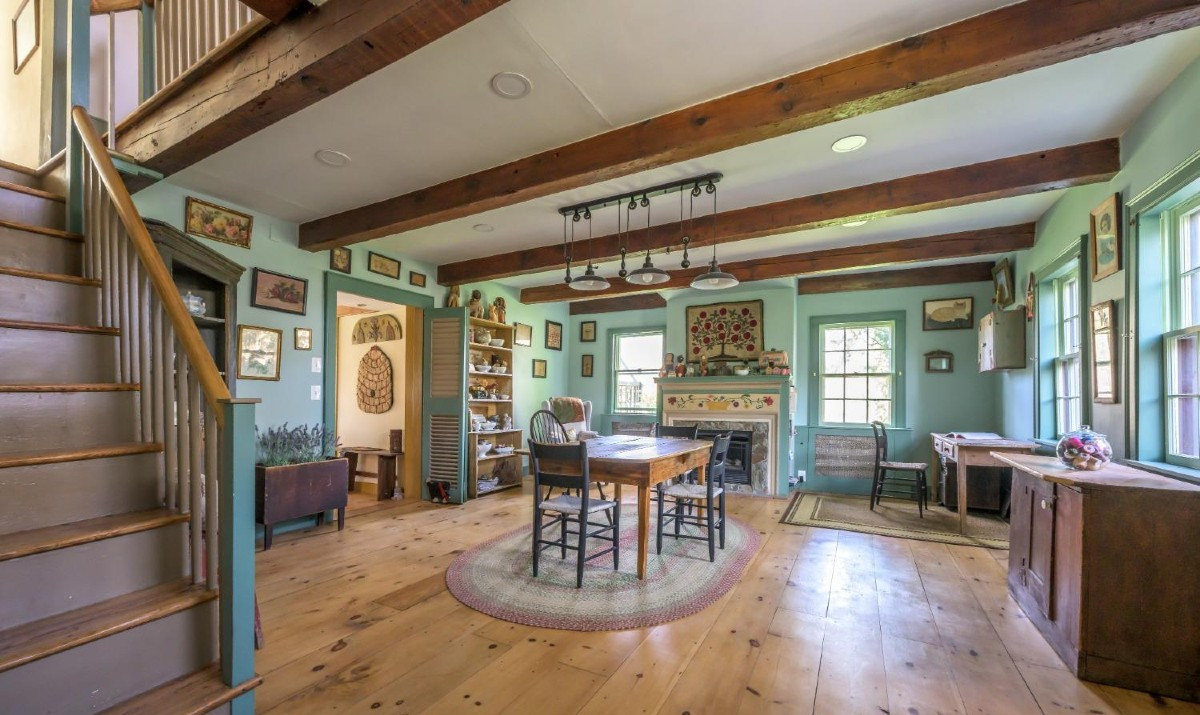 This Dutch Colonial in Claverack is a blend of old and new. The dining room is the heart of the home, with beamed ceiling and wide-plank floor. Upstairs, the bedrooms maintain the old-world feeling with wide-plank flooring and built-ins.The barn offers additional space. The stone flooring has radiant heat. Listed at $715,000 by Berkshire Hathaway Homeservices New England Properties.