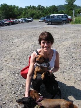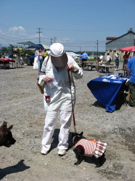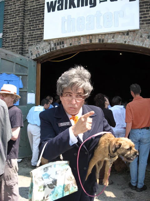 Despite the sizzling heat, tous les chiens of Hudson and beyond, their proud and hopeful owners in tow, paraded down Warren Street on Saturday before gathering at the Basilica for the Walking the Dog Theater benefit dog show. A panel of dogly-wize children analyzed each canine's merits before awarding it a suitable prize. Musty Chiffon, in the guise of Mrs. Boyle, was there with a purse-full of kibble to keep little Psyche in line. Her sage fashion advice: "My dears, this is not a day for navy blue."