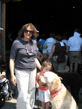 Andrea Lowenthal with dachshunds Lily, Harry and Max.; Jean Stoler and her granddaughter Ella Stoler with Cooper, a golden doodle.