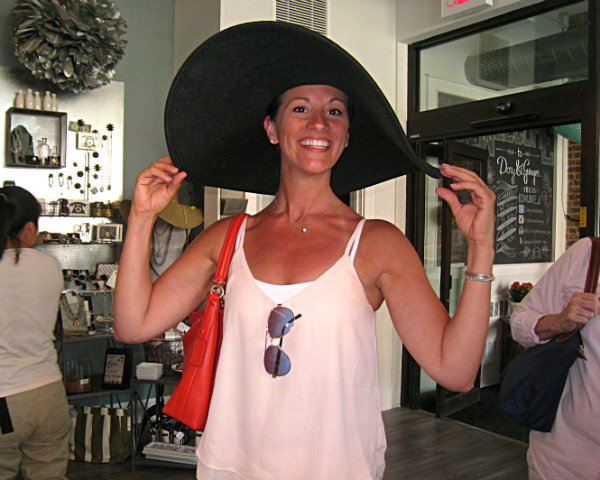 Sue Cannold, visiting from New Jersey, models the merchandise.