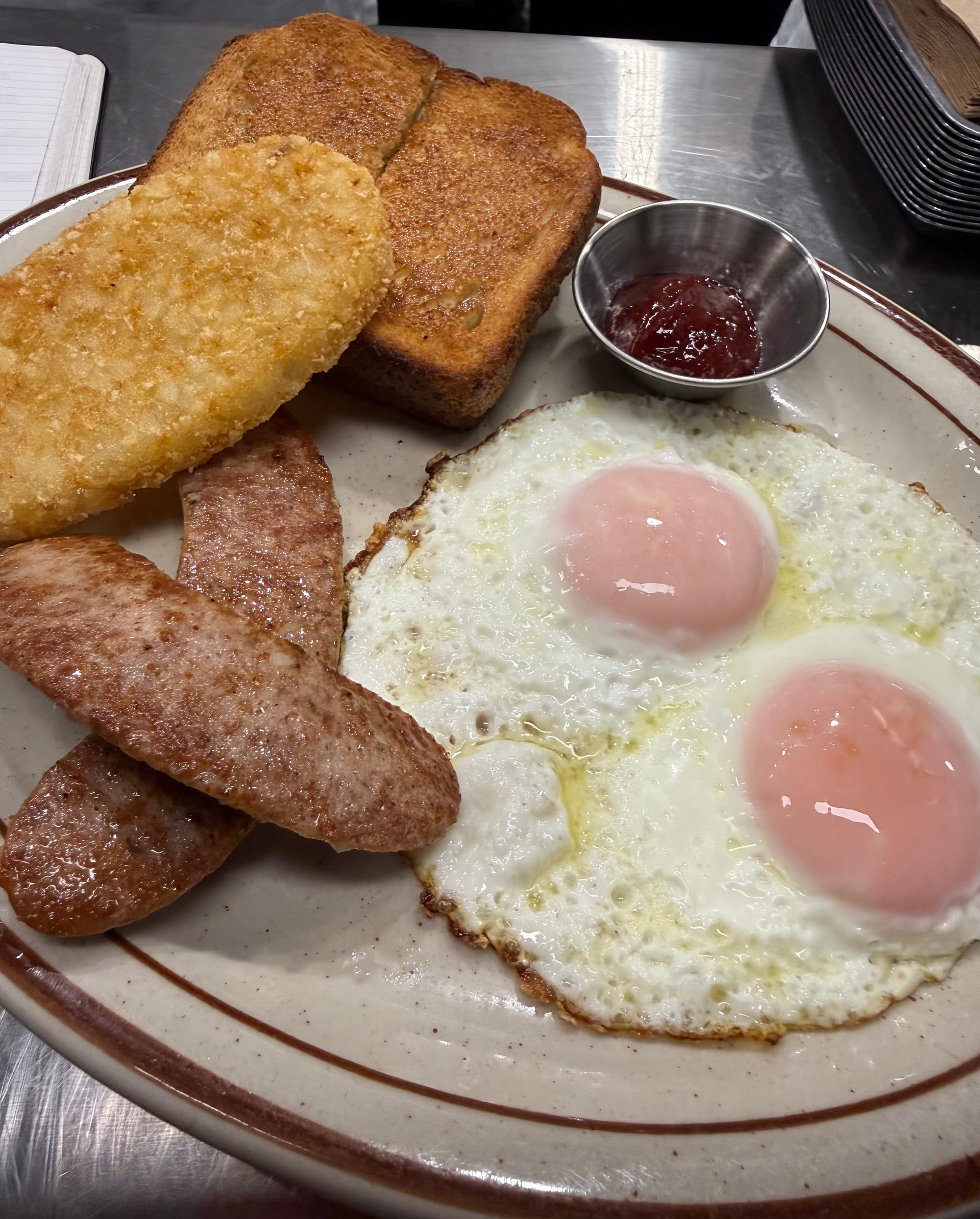 Breakfast centers on the egg plates, all served with a hashbrown patty, fries or fruit, and buttered toast and jam, ranging from a straight two-egg plate ($12) up to ham steak and eggs ($21), with corned beef hash ($16) and scrambles ($15) in between. The egg and cheese on a bun ($8), with Northwind kielbasa, bacon, or sausage if you like ($12), is worth getting off the Taconic for on its own. Buttermilk pancakes ($12) and French toast ($15) round out the morning.