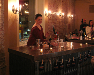 Amy Krzanik reports from Pittsfield. It was an evening of stiff drinks and even stiffer competition as the first-ever Farm-to-glass Throwdown on Sunday, Nov. 7 pitted some of the Berkshires’ best bartenders against each other to see who could craft the finest cocktail. The fundraiser for the new Downtown Pittsfield Winter Farmers Market was held upstairs at Hotel on North. Competitors included Johnny Burns from Methuselah Bar and Lounge; Ashley Junod from Brava Lenox; Meghan Merrigan from District Kitchen & Bar; Kristen Parker from Dream Away Lodge; Billy Paul from allium restaurant and bar; and Joseph Scully from Prairie Whale. Contestants picked their poisons from a list of ingredients found at the farmers market and liquors from co-sponsor Berkshire Mountain Distillers. Their concoctions were judged by Mitch and Seth Nash of Blue Q; Nathan Hanford, an artist with Soldier On; Caitlin Harrison from Mise Wines; Waterfall Perry of Jan Perry Realty; and Nancy Thomas, co-owner of Mezze Restaurant Group. Paul, Scully and Parker (whose drink, "The Dodo," won the “people’s choice award"), continued on to round two, where they had mere minutes to create a drink using a surprise ingredient. The creative use of that ingredient, elderflower jam, made Scully a champion. The winter farmers market begins this Saturday and will run the second Saturday of every month from 9 a.m. to 1 p.m. at the Pittsfield Boys and Girls Club. Above, market committee chair Regina Burgio and market manager Jess Conzo.