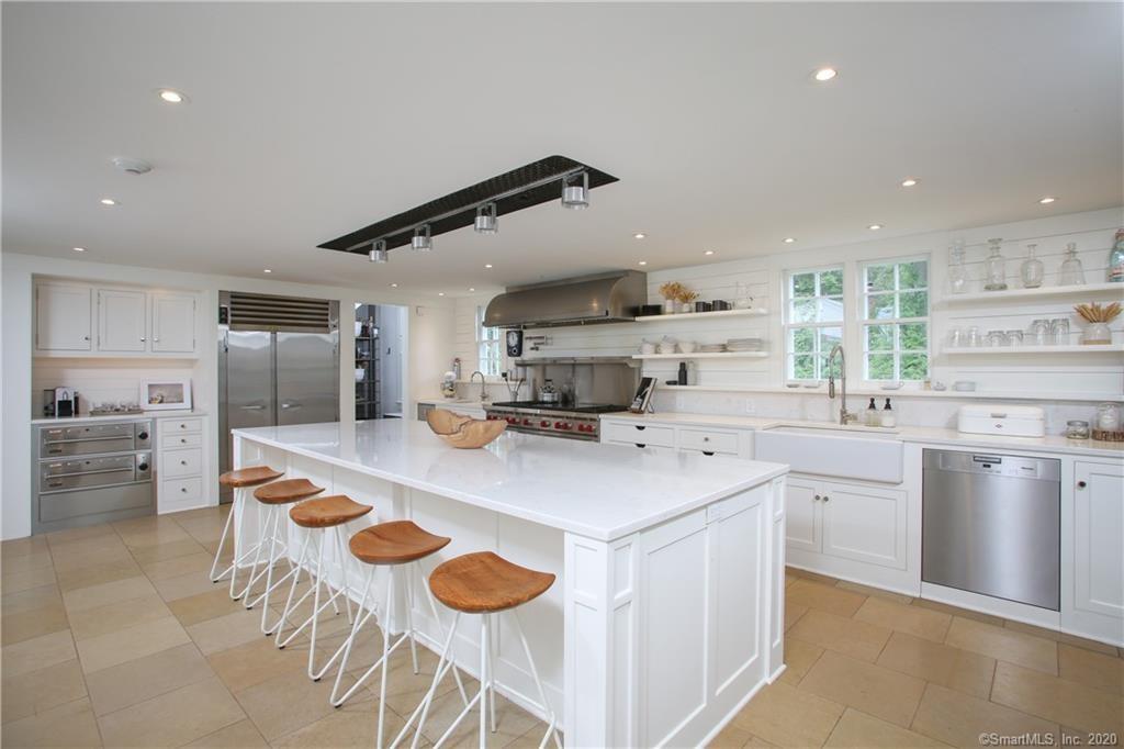This Colonial farmhouse combines walkability to the historic village of Kent with country living on 11-plus acres. There are 6 bedrooms and 6 bathrooms. a formal dining room, library with builtins and fireplace, game room with French doors that lead to the covered front porch. The chef's kitchen offers a Wolf range, warming draws and a quartz island. There are multiple gathering spaces, game lawns and an antique barn , plus a saltwater pool and multiple stone fences. Listed at $1,995,000 by William Pitt Julia B Fee Sotheby's International Realty.