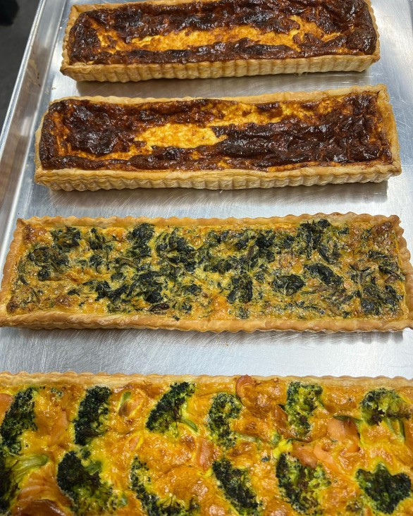 Of course, all the camaraderie in the world is for naught if the proof weren’t in the pain. That’s where the choice of ingredients and making the extra effort comes in. Barbagallo uses Callebaut chocolate from Belgium, European butter (82% fat for better flavor), makes her own mix of seeds and roasts them before adding to the bread (it makes a difference, she insists), and uses pink salt instead of sea salt because, she says these days, fancy sea salt contains microplastics. She invested in blue steel pans (heavy as heck) because the bread bakes in them more evenly. Aesthetics are just as important; quiche in a rectangular shape with fluted edges are as beautiful to look at as they are to eat; babkas do their own thing when they’re baking and people are attracted to their idiosyncratic shapes and swirls.