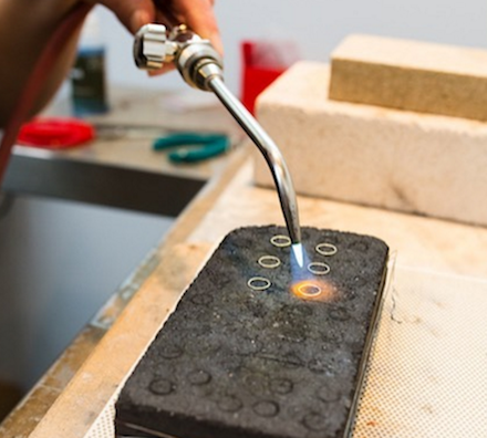 After college at Brown, Jenna parlayed an internship into a 13-year career as a brass mount maker at the Metropolitan Museum of Art. The job afforded her a lot of technical experience, forging perfectly fitted cradles for art objects of international cultural importance. It also, she says, affected her artistry, surrounded as she was, every day, by some of the greatest art in the world. She allows that her work has been directly and in some ways subconsciously influenced by design elements of African art and the Oceana exhibit at the museum, which she worked on extensively. She’s currently working on a new design based on a traditional stacked Byzantine ring.