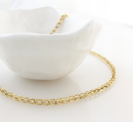 A 22k gold chain made with ancient goldsmithing techniques particular to high karat gold. "Chains are a particular interest of mine," Jenna says. "I don't sell jewelry with prefab chains, I make every link of every chain we sell and I love the meditative process of it."