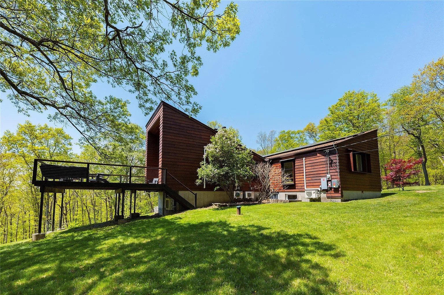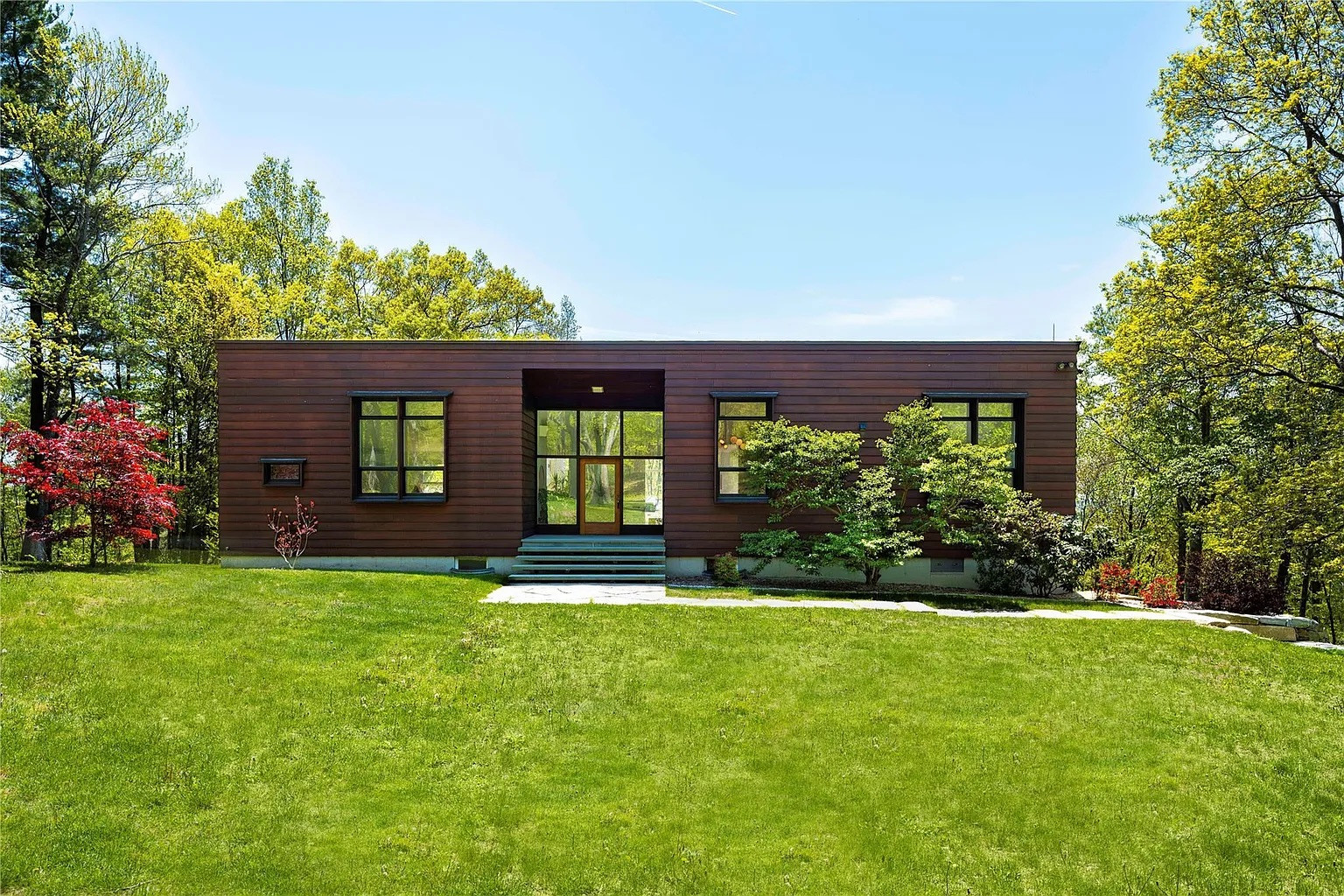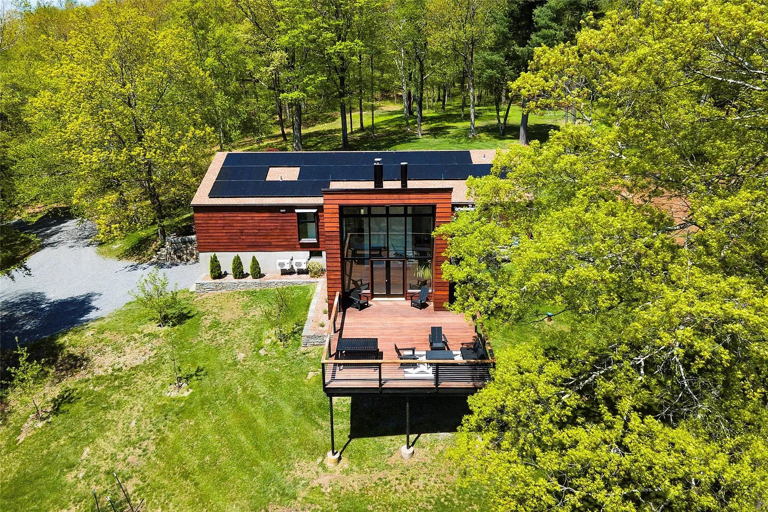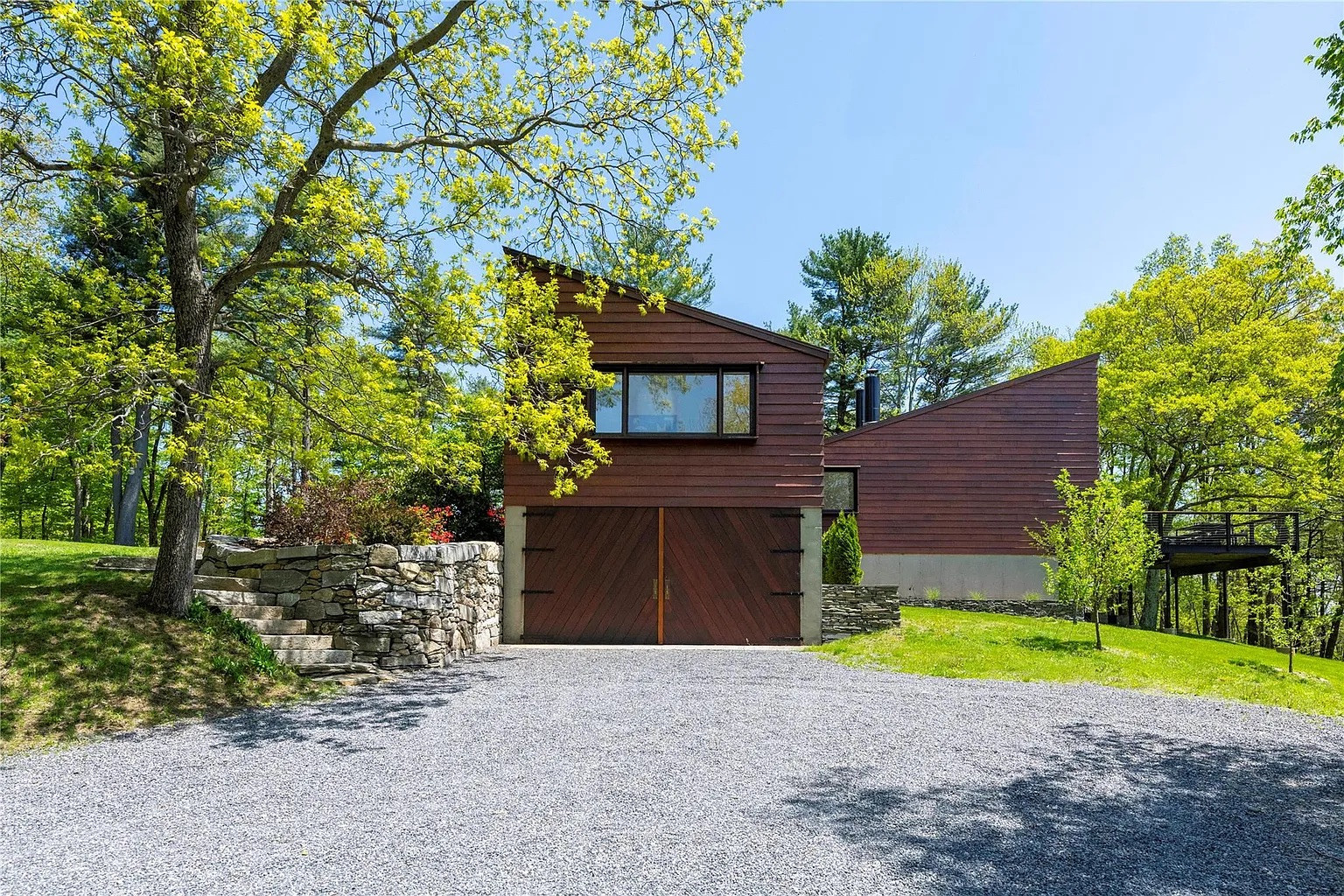 The land has been cultivated with new fruit trees, dry-stacked stone walls, and floating stairs that create a modern outdoor aesthetic. Solar panels provide energy efficiency and a large deck allows for lots of quiet, contemplative outside time. One more bonus: this house is minutes from the Wassaic Metro-North station.
