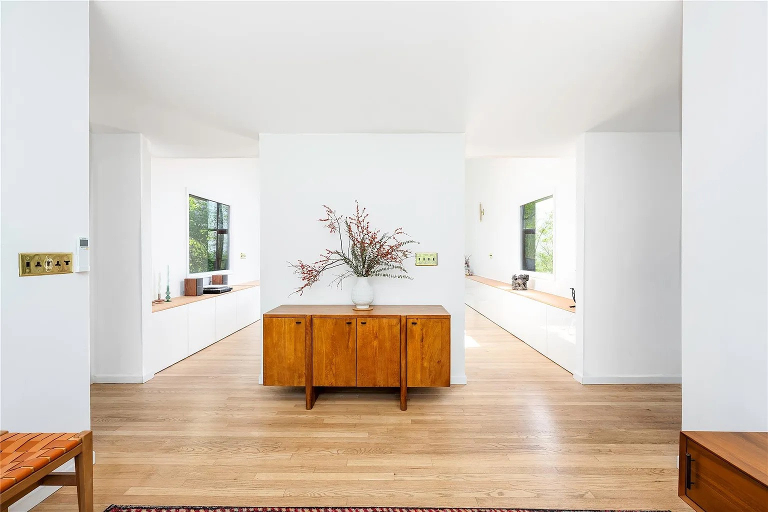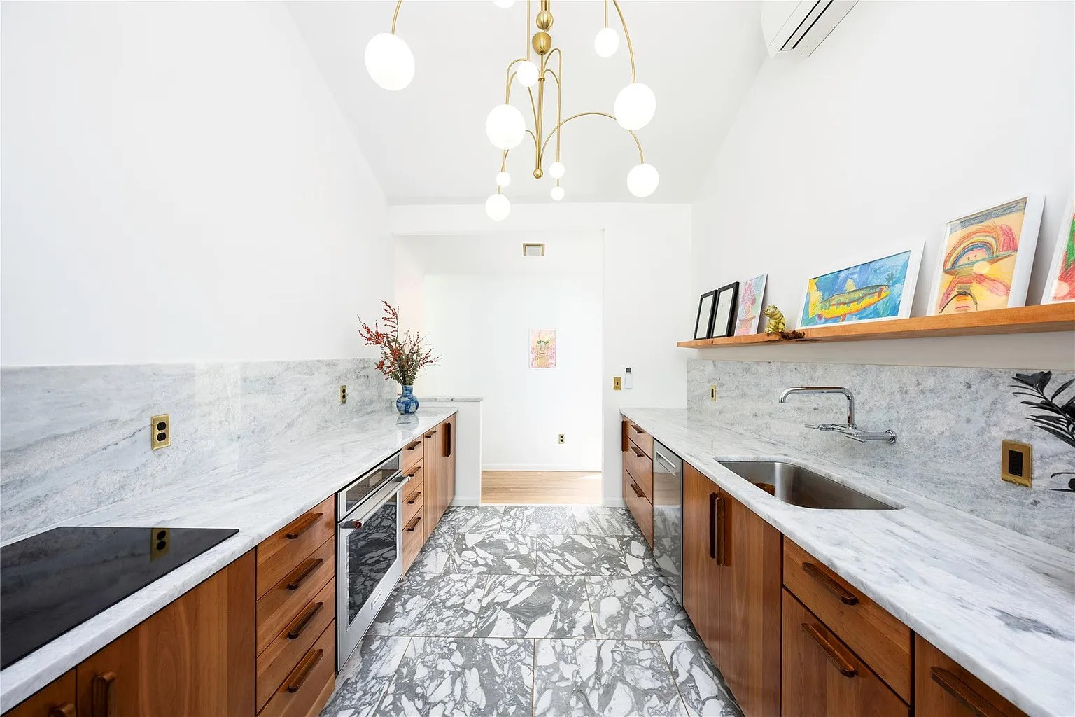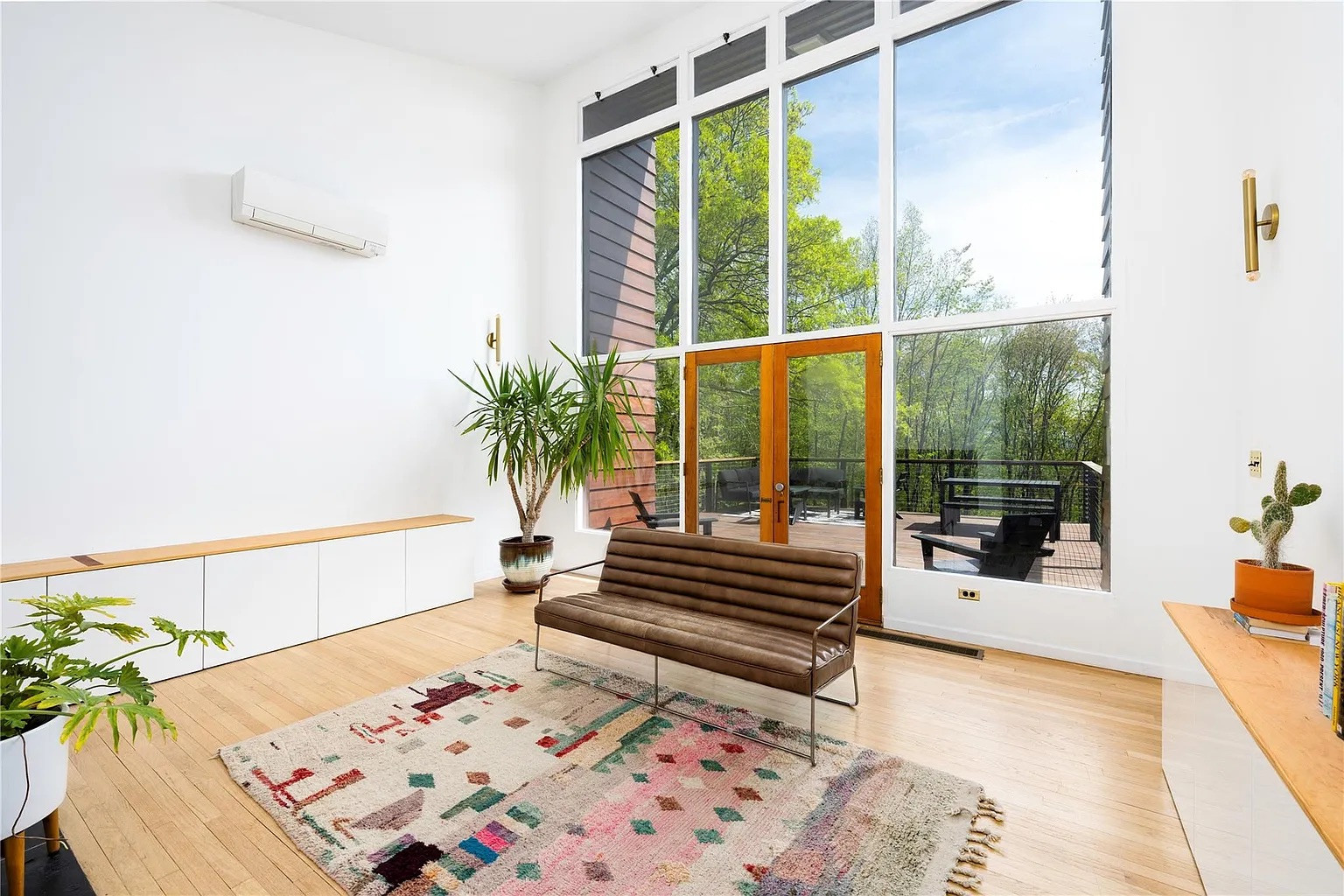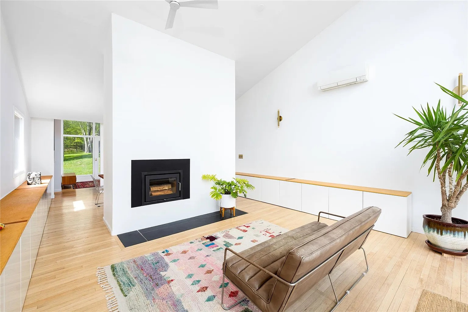With two bedrooms, two bathrooms and 1,802 square feet, this home has vaulted ceilings, floor-to-ceiling windows, hardwood floors, and a modern wood-burning fireplace that helps define the common areas. The updated kitchen includes Italian marble countertops, cherry cabinets, and new stainless appliances. A barn door leads to the garage and a walk-out lower-level art studio, a rare find in homes in this area.