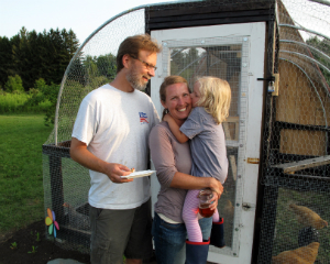 Brett Larmon and Wandering Star owner Chris Post; Chris and farm manager Kristen Laney with daughter Nora in front of the new chicken coop at Arrowhead's CSA farm.