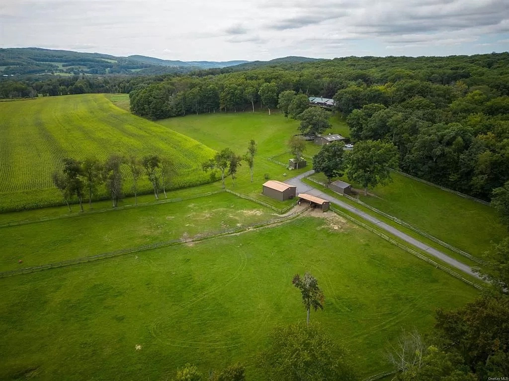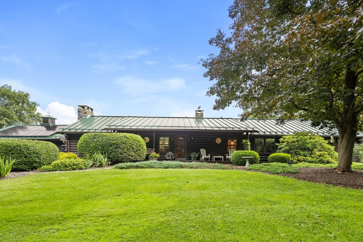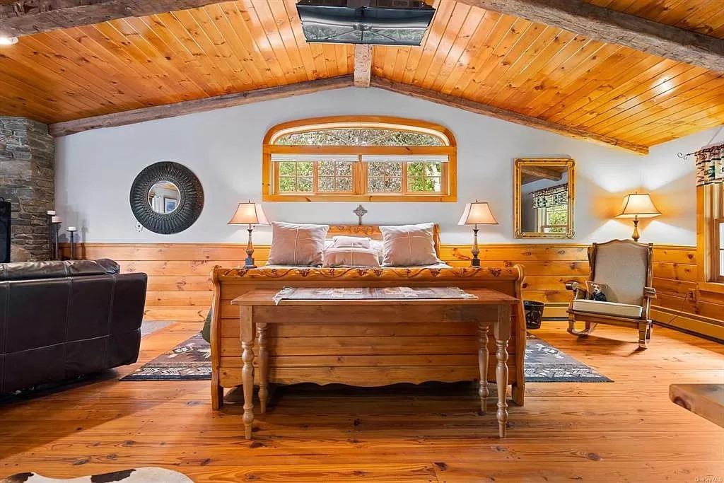 An elevated log cabin-style home in Pine Plains sits on 19-plus acres with mountain views. There are three bedrooms and three bathrooms, an open floor plan and vaulted ceilings. The downstairs includes a game, exercise or media room with kitchenette. The property also includes a hay barn, paddock, four-stall horse barn and tack room. Listed at $1,675,000 by William Pitt Julia B Fee Sotheby's International Realty.