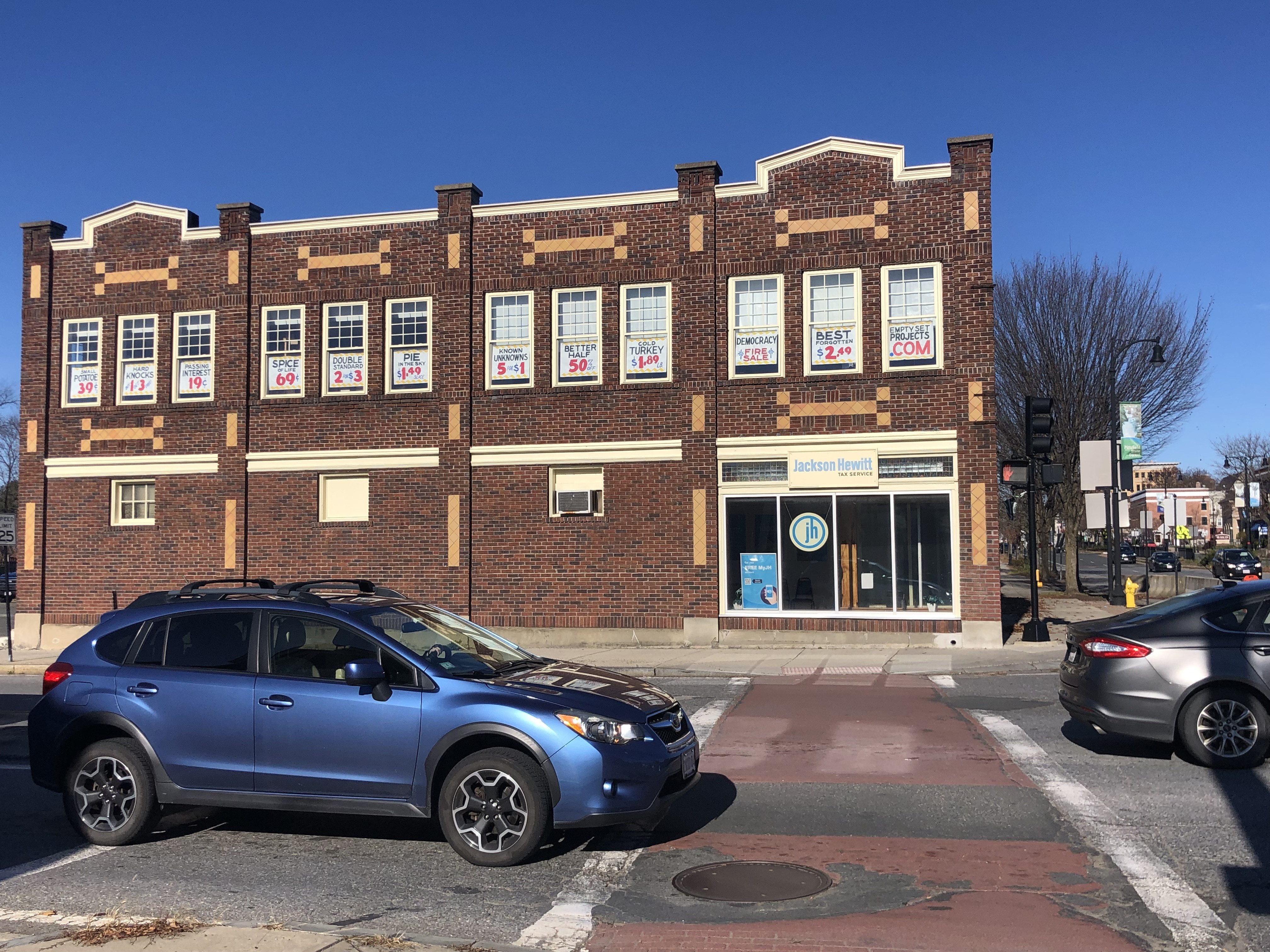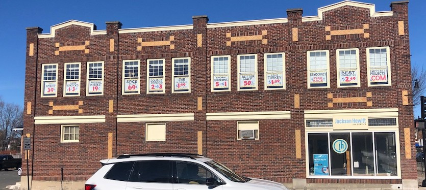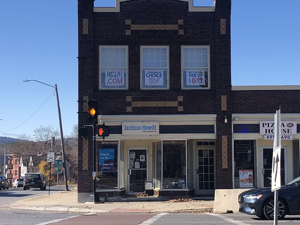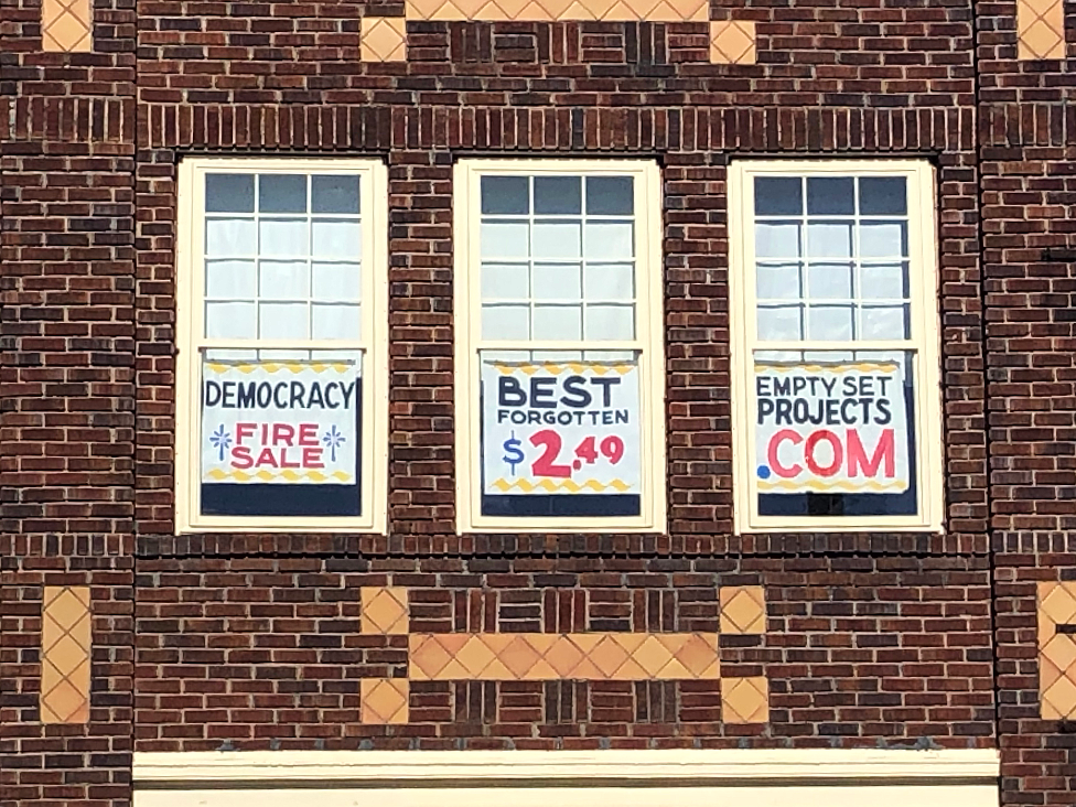 At a busy intersection in Pittsfield, you can get Hard Knocks for Buy 1 Get 3 Free, Known Unknowns, 5 for a $1, and Democracy on a Fire Sale. The “market” where these sentiments are sold is located in the windows above the storefronts at South Street and West Housatonic. Since 2001, these signs have provided drivers and pedestrians brief, thought-provoking moments as they wait for the light to change. The window signs are part of an ongoing series titled “BIG SALE,” and are the creation of artists Michael McKay and Monika Pizzichemi of Empty Set Projects (their own tagline: “Art, like crime, does not pay”).