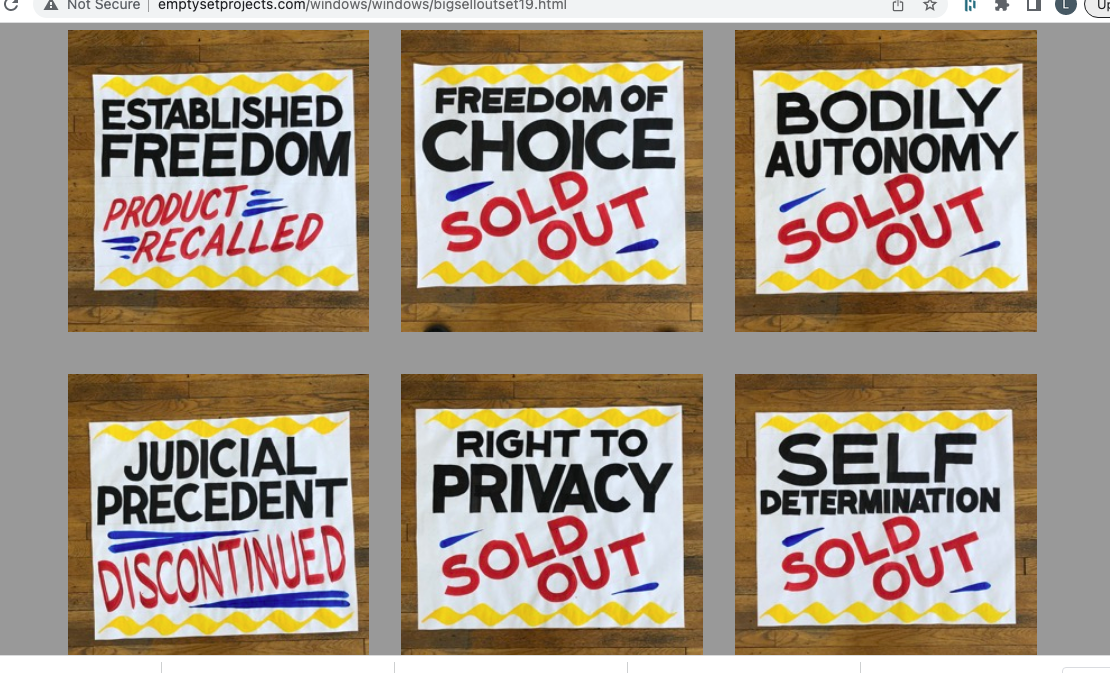 “I find inspiration in outdated, cold war era, American advertising and textbook illustration styles and the hollow fiction of the American dream that they signify,” McKay writes in his artist’s statement. While his hand-lettered typography takes us back to 50s and 60s, the signs’ messages are spot on for today, even if we don’t want them to be. Especially this one, facing South Street right now: Freedom of Choice, Sold Out.
