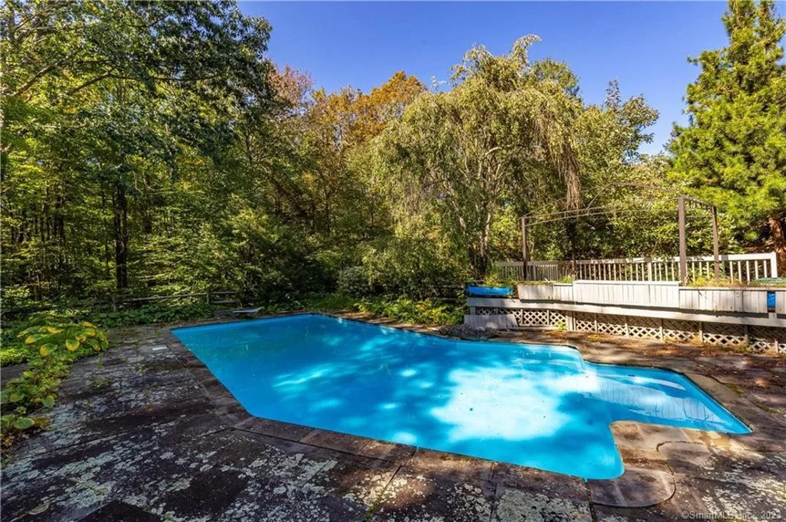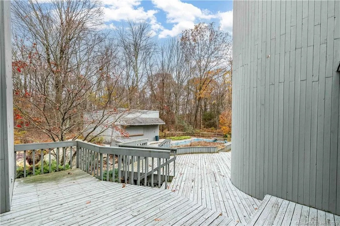 Enter this Litchfield Contemporar through French doors to an open floorplan with cathedral ceilings. The living room features a fireplace and wood floors. There are three bedrooms and four bathrooms, a spiral staircase to a loft space, a three-car garage, in-ground pool, and new roof. The property backs up to a non-buildable state park preserve. Listed at $724,900 by Keller Williams Legacy Partners Realty.