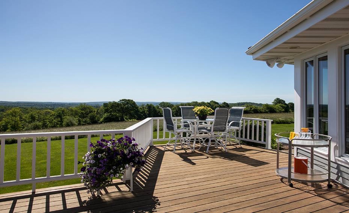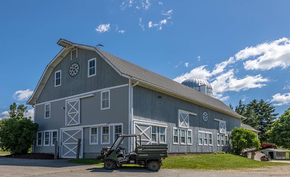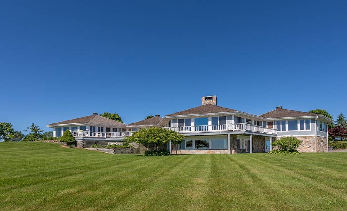On 90-plus acres, this Litchfield estate includes 3 bedrooms, 5 full and 2 half baths. There are two stone fireplaces, vaulted ceilings, a bright white kitchen, and a master bedroom suite with access to the decks and private seating area that overlook the property. The mahogany decks feature retractable awnings and a heated/screened-in porch. A working farm property, it has multiple barns, a chicken coop, hay storage, and a possible stable. Professional landscaping features specimen plantings, fruit trees and blueberry bushes. Listed at $1,995,000 by William Raveis Realty.