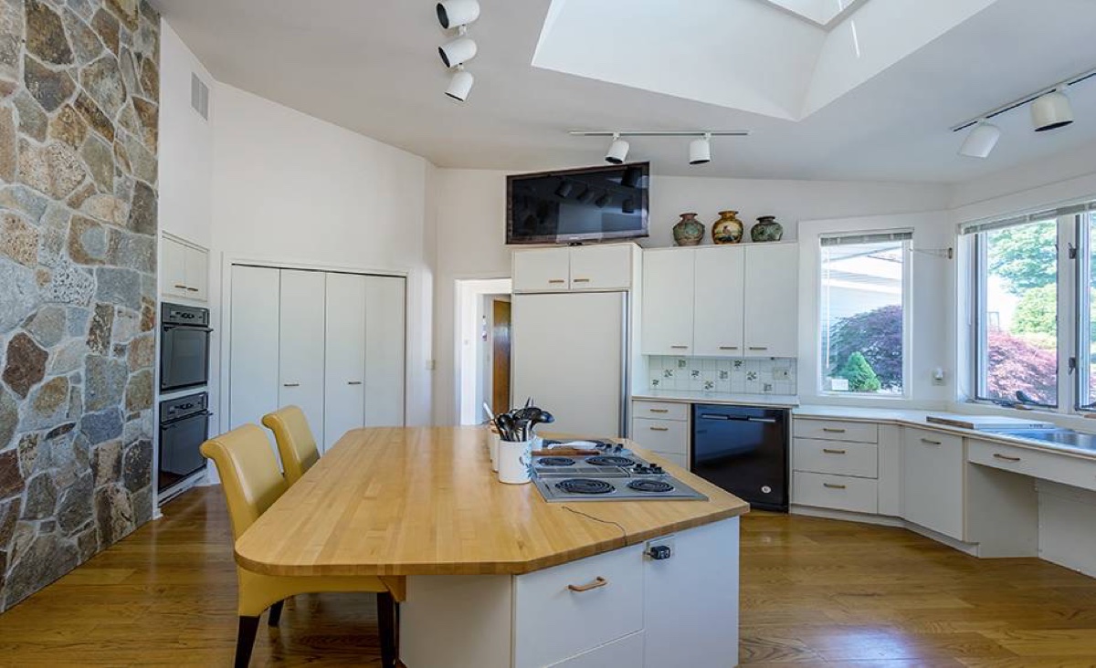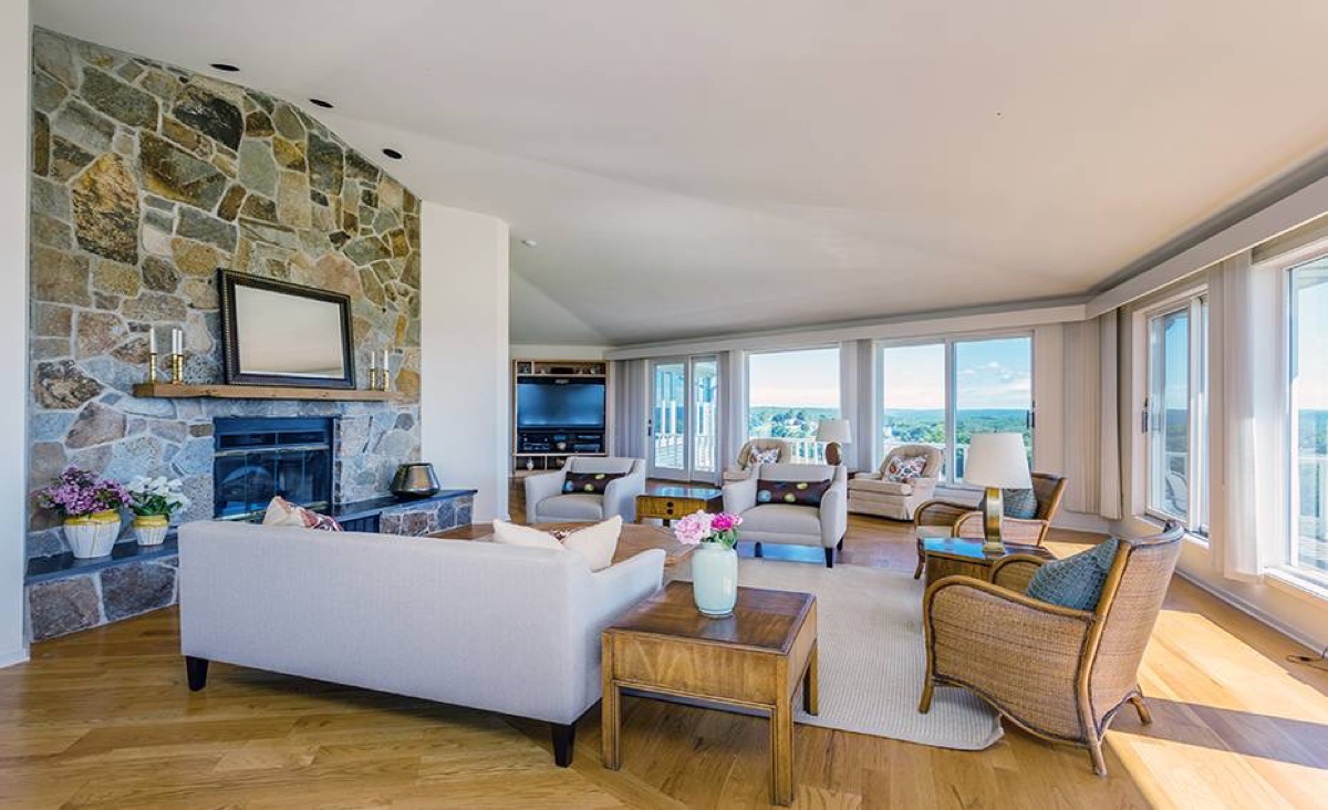 On 90-plus acres, this Litchfield estate includes 3 bedrooms, 5 full and 2 half baths. There are two stone fireplaces, vaulted ceilings, a bright white kitchen, and a master bedroom suite with access to the decks and private seating area that overlook the property. The mahogany decks feature retractable awnings and a heated/screened-in porch. A working farm property, it has multiple barns, a chicken coop, hay storage, and a possible stable. Professional landscaping features specimen plantings, fruit trees and blueberry bushes. Listed at $1,995,000 by William Raveis Realty.