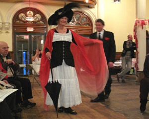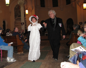 Amy Krzanik reports from Pittsfield. As part of this year’s 10x10 Upstreet Arts Festival, Shire City Sanctuary held a February Frolic event on Valentine’s Day, February 14. The Berkshire Historical Society’s “revealing" lingerie parade of 10 women in 10 outfits from 10 eras kicked off the evening’s festivities. The historical fashion show, designed by Joan Degusto and staged by BHS's Director of Communications J. Peter Bergman, coincides with the Historical Society’s latest exhibit at Arrowhead – Close to the Skin: A Revealing Look at Lingerie – on display through May 3. The show was followed by dinner downstairs, and, later on, a dance party with DJ BFG. Above, model and Arrohead farm manager Kristen Laney, emcee Joan Degusto and model Fianna Toolan.