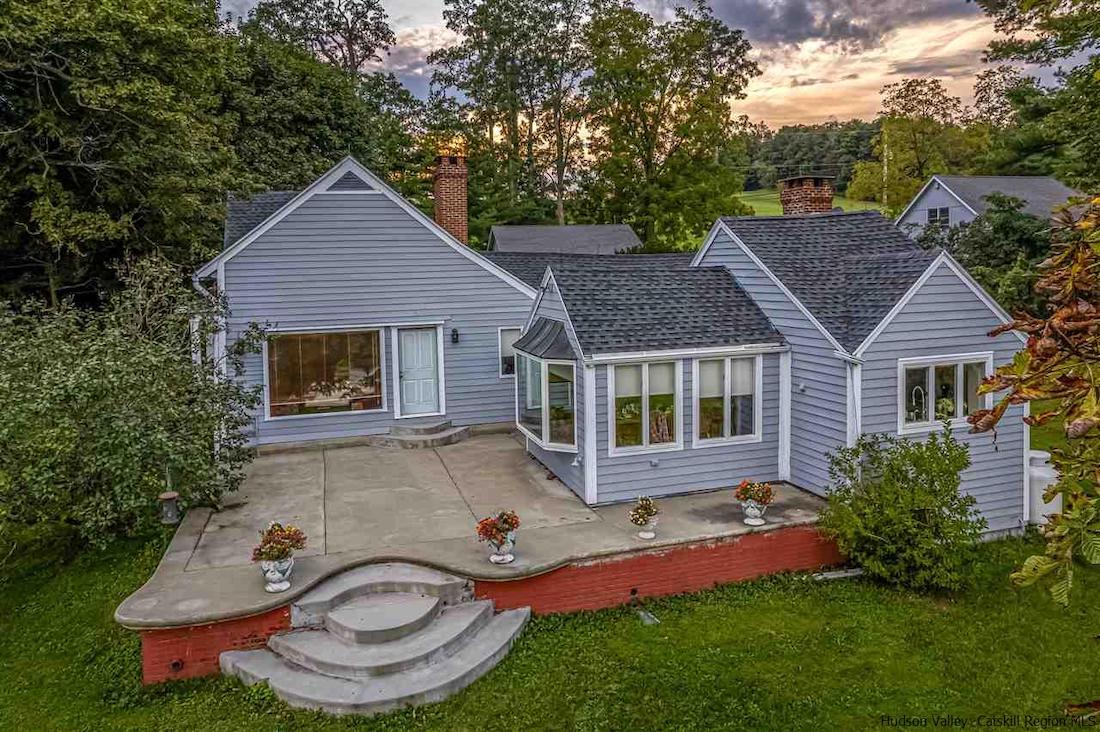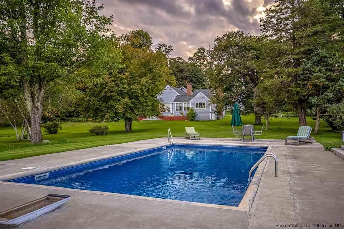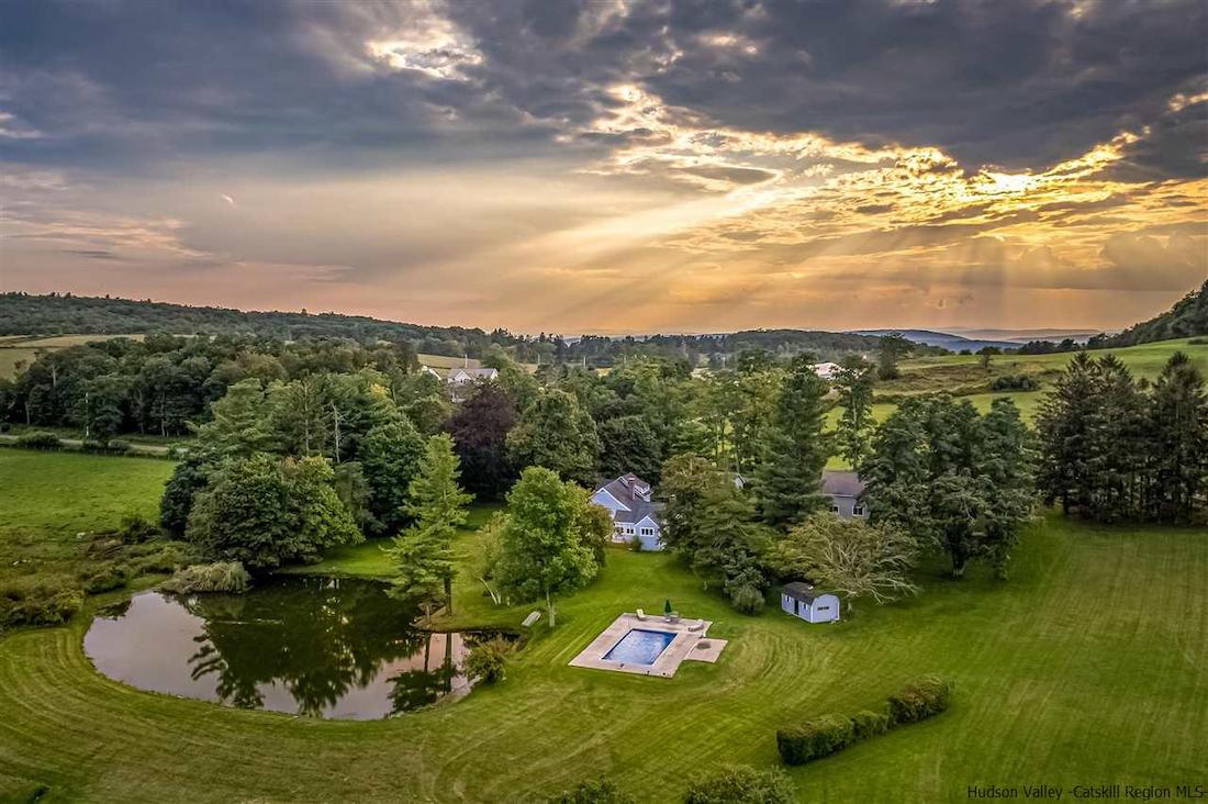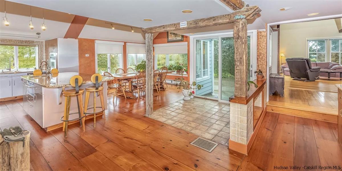 An updated country farmhouse just minutes from the village of Millerton has three bedrooms and two bathrooms, vaulted ceilings in the living room, a wood-burning stove in the gourmet kitchen, and a stone patio. There are views of the Berkshire mountains from most rooms and the property inclues a sauna, pool and pond on five manicured acres. Listed at $1,850,000 by Windsor Realty Services.