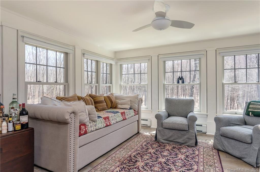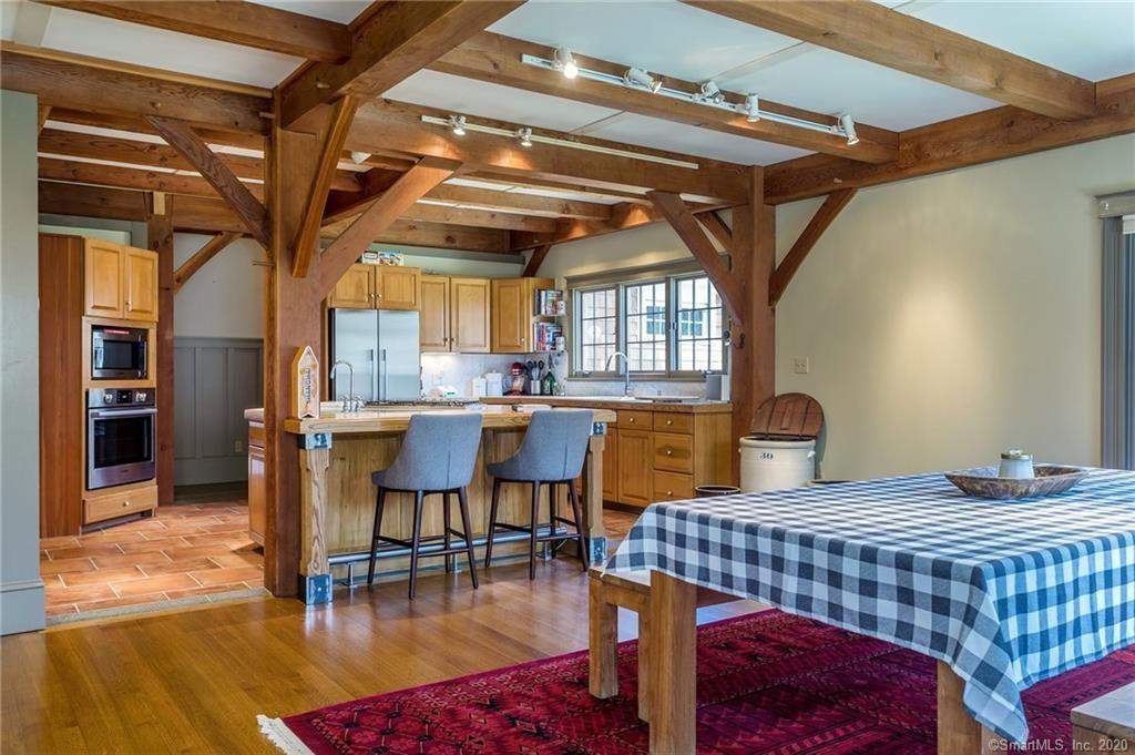 A "classic" New England farmhouse in Kent is contemporized with a post-and-beam frame and open floor plan. There are three bedrooms and three bathrooms, a large eat-in kitchen, a sunroom that opens to a screened porch, formal dining room and deep covered porches. The lower level of the house is partially finished as recreation space with potential for a private guest suite. The home is set on 8.38 acres and surrounded by 3,500 contiguous acres of protected land. Listed at $1,595,000 by Willam Pitt Julia B Fee Sotheby's International Realty.
