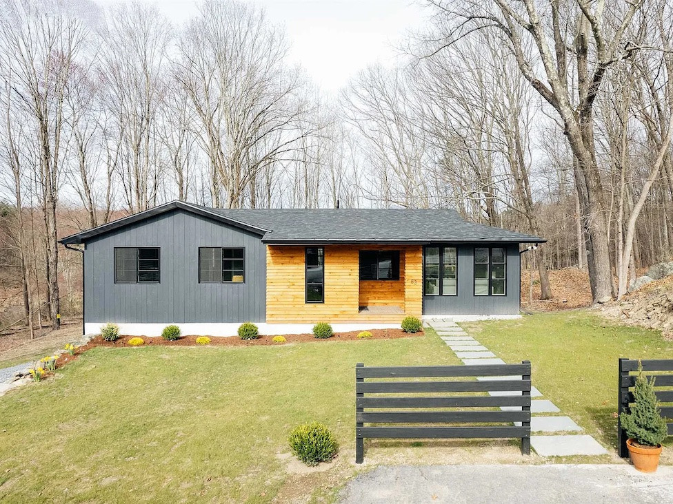 Built in 1960, this Staatsburgh home has a new foundation, septic, heat and AC. Surrounded by woods, the house has three bedrooms and two bathrooms, and a large modern kitchen that opens into dining and living space with access to the deck. The ground floor includes a workshop and expansive media room. The flat parcel offers space for a pool, hot tub, garden or swing set. Listed at $735,000 by Upstate Down.