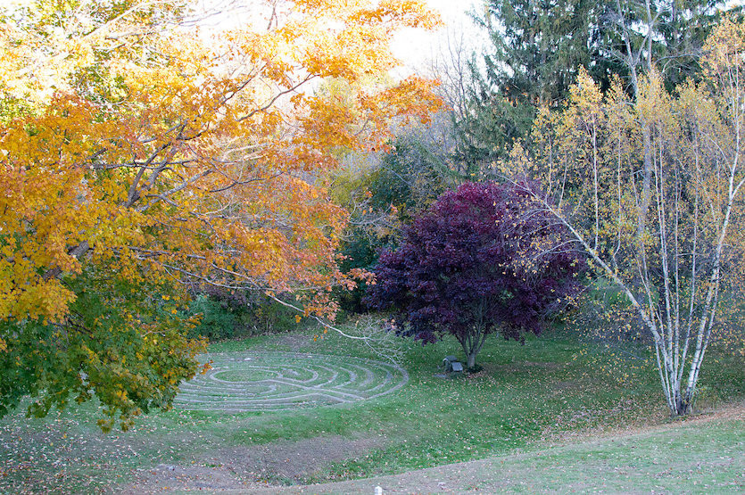 Our Lady Of Hope RC Church, Copake Falls, New York. Like at St. James, the labyrinth here is inlaid in the grass behind the church. The peaceful spot is surrounded by an old stone wall that opens onto a bucolic field beyond. It is hard not to feel somewhat transported by the unmistakable influence of the church’s Irish lineage. There’s an interesting, incidental synergy between the traditional design of the labyrinth and Celtic knots common in church iconography.