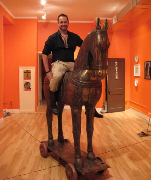Performance artist Homer Snyder's masking tape window display; John Findysz astride a brass-clad Trojan horse borrowed for the evening's performance from Fun House Antiques on Warren Street.