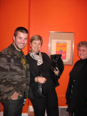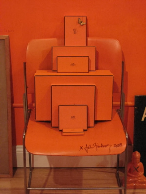 Aaron Enfield, Sally Helgesen with Rocco the Pomeranian, and Greta Boeringer, the Hudson libarian; Another Story: a stack of Hermes boxes on a chromatically compatible chair.