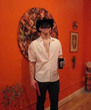 The fun at Findustry, a gallery/store on Warren Street owned by John Findysz, always starts outside, with the windows. These had been done on Saturday afternoon, November 8, by the star of that evening's performance piece, Homer Snyder (in cowboy gear at left), using nothing but masking tape. The show, "Dirty Dishes and Other Stories," runs until it changes. Orange you sorry you weren't there?