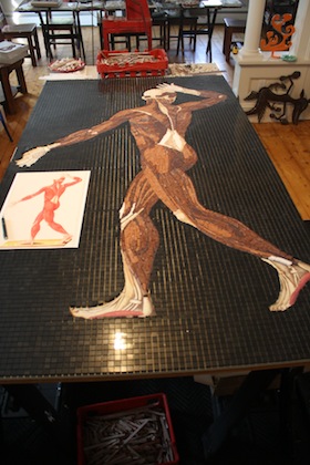 Unger is an interesting mix of practical tradesman and unfettered creative. His technique, which involves skillfully cutting into the rusted ends of propane tanks with a plasma torch, has given him the freedom to indulge his inspiration. He doesn’t seem to feel burdened by the big pile of as-yet-uncut tank ends in front of his shop. If he feels like it, he'll go work on something else, like the new totem-like light fixtures he’s begun making, or his music or the massive mosaic he’s working on in his indoor studio. That six-by-four-foot work is made of thousands of tiny pieces of marble and depicts the musculature of the human body in the style of a pre-photography medical reference drawing. The intricacy is daunting, the form is beautiful, and the craftsmanship is impeccable. There’s an artist’s touch to it that makes it mesmerizing yet approachable, as if it could just as easily hang in the finest museum as it could be used as an absurdly extravagant kitchen backsplash. And, indeed, Unger intends to make 12 of these large mosaics for a future museum show. The scale and design of his ambitions feel like a mixture of artist and inventor. “I grew up making stuff," says Unger, who spent much of his youth in the woods of northern Michigan. “I had little supervision and a lot of power tools. I was inspired by nature in a deep way I wasn’t aware of for a long time. You can tell that that knowledge is so ingrained in the work."